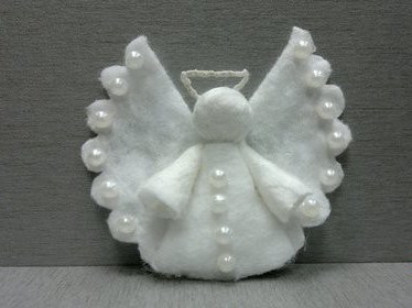 1. Такие смешные и, одновременно, красивые ангелочки из фетра нескольких цветов потребуют для своего создания швейную машину, поскольку они состоят из нескольких слоев фетра, несколько перламутровых бисеринок и глазки-бусинки. Задора выражениям их лиц придает румянец, нанесенный красками непосредственно на войлок.