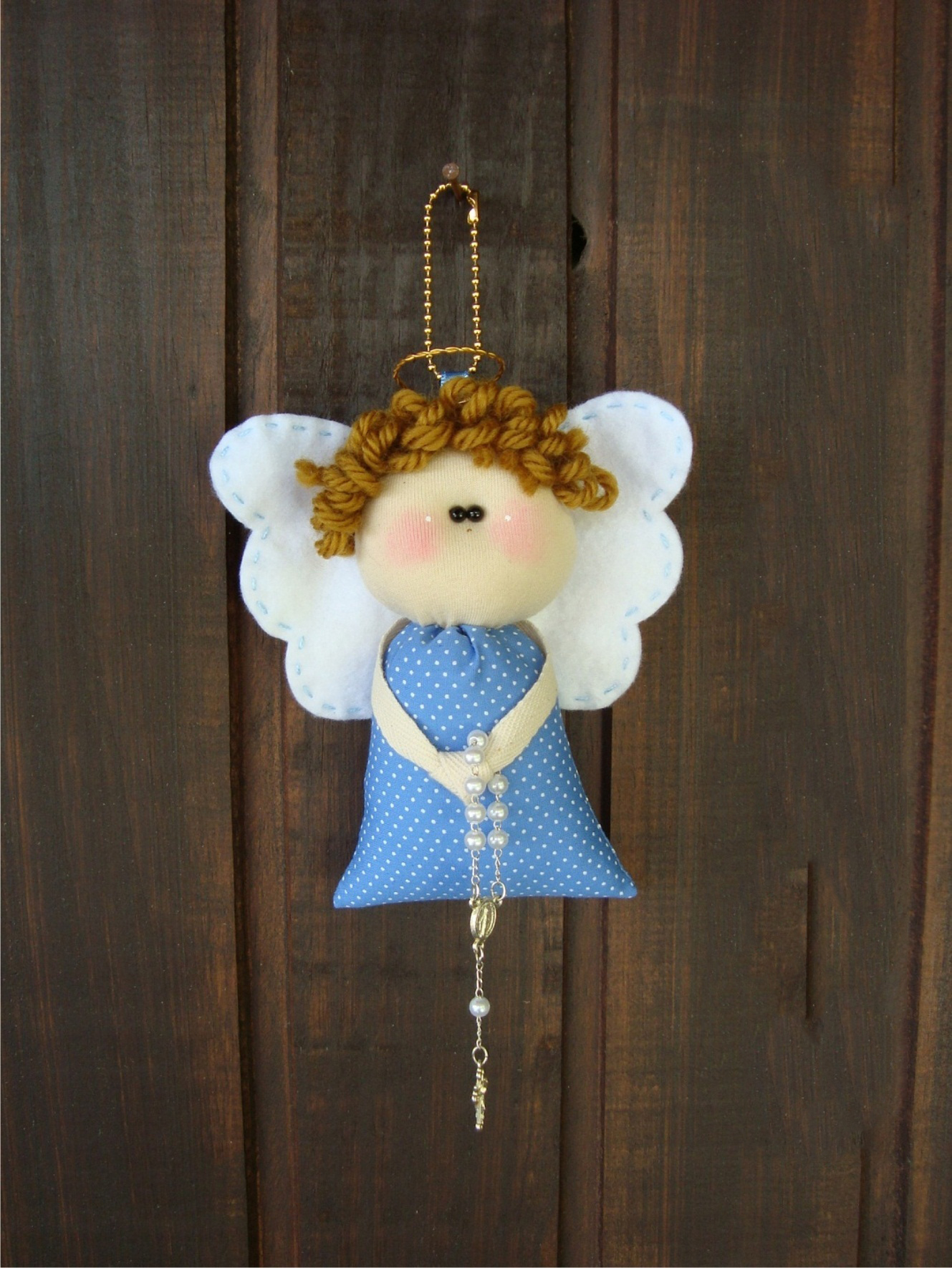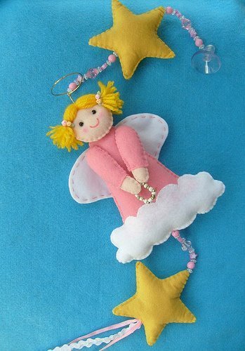 6. Совсем задорный ангел-девочка с волосами, смешно завязанными в два хвостика. В руках она держит четки из бисера, а ее ножки прикрыты облаком, на котором она парит. Над ней и под ней на подвеске расположены фетровые объемные звездочки. Над головой – нимб из проволоки. Оригинальная, но все-таки совсем несложная модель, которая вызовет восторг у детишек и улыбку у взрослых.