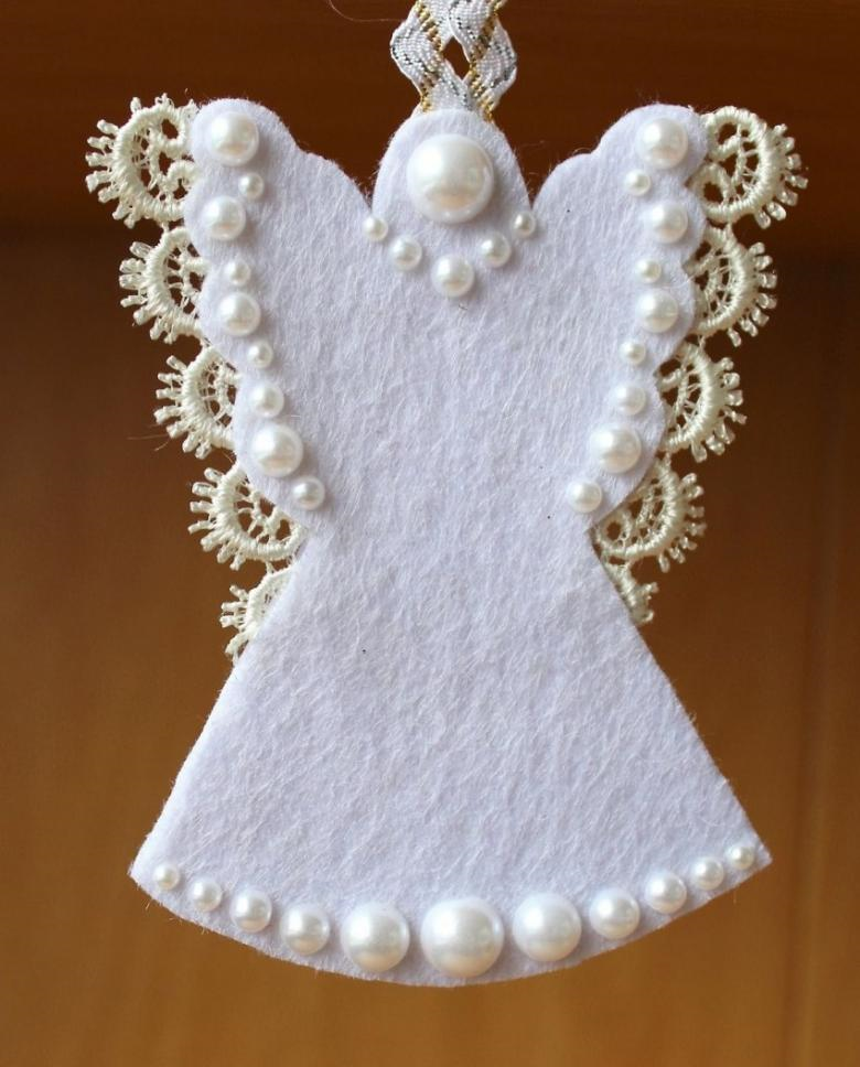 2. Восхитительно, возвышенно и нарядно выглядят рождественские ангелочки с условным силуэтом, без прорисовки лиц и других деталей, выполненные из белого фетра и расшитые перламутровыми бусинами и бисером. В качестве нимба на первом фото использованы плоские деревянные бусины. А на втором – крылья отделаны кружевом.