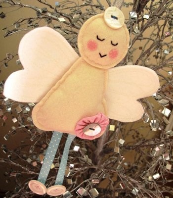 7. Очень простой в исполнении ангелочек, выполненный из фетра и ситца, декорированный пуговицами. Фигурка и крылышки этой модели сострочены из парных фетровых деталей и слегка наполнены наполнителем для придания ей некоторого объема. Геометрия деталей упрощена до предела, а черты лица нарисованы маркером и красками прямо на фетре. Нарочито примитивная манера изготовления делает поделку по-детски трогательной и милой.