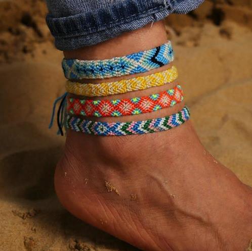 Широкие возможности для вариаций ножных браслетов открывает владение техниками плетения из шнуров и нитей. У молодежи очень популярны такие плетеные из разноцветных нитей «фенечки» для ног. Нитки разных цветов образуют затейливые орнаменты, весьма оживляя наряды разнообразными цветовыми сочетаниями. Носить такие анклеты можно вместе с обувью и одеждой разных стилей, в том числе в стиле кэжуал.