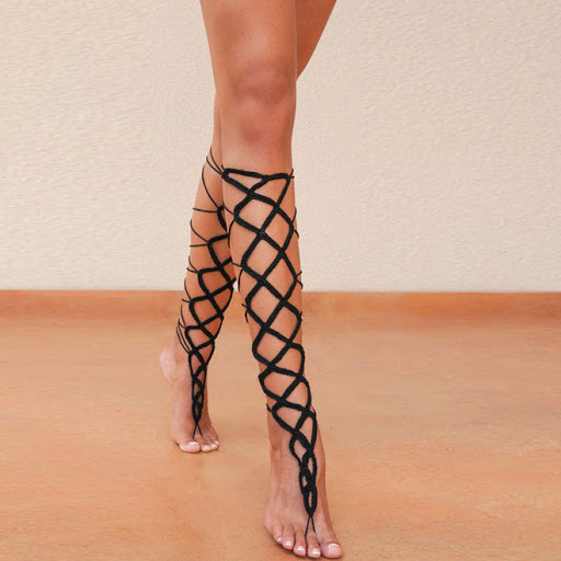 Тем модницам, которые хотят пойти дальше в создании модного образа, стоит обратить внимание на плетеные ажурные барефуты, полностью покрывающие голени и икры. Это аксессуар для девушек, предпочитающих экстравагантные аксессуары и наряды. Носить его можно с самой разной обувью. Процесс создания таких изделий более трудоемкий, хотя особой сложности не представляет, здесь скорее больше понадобится усидчивость при наличии навыков аккуратно плести в технике макраме.