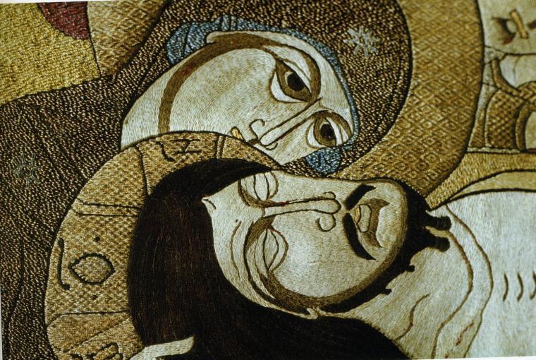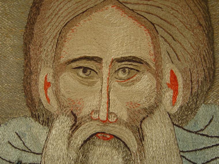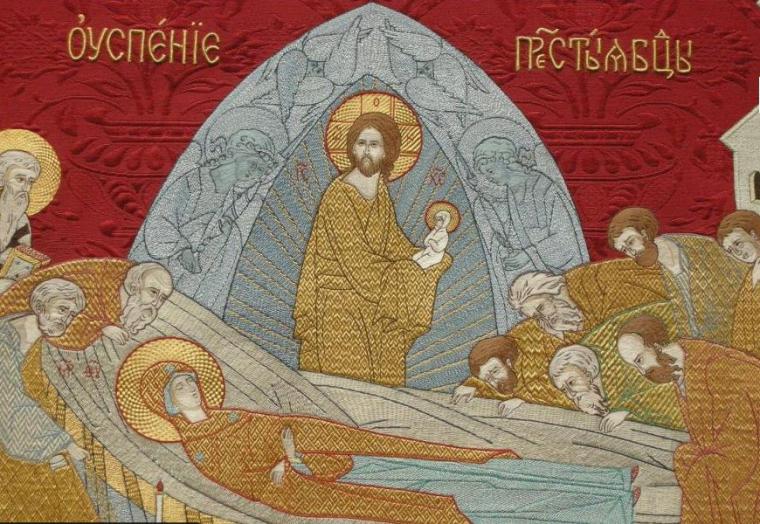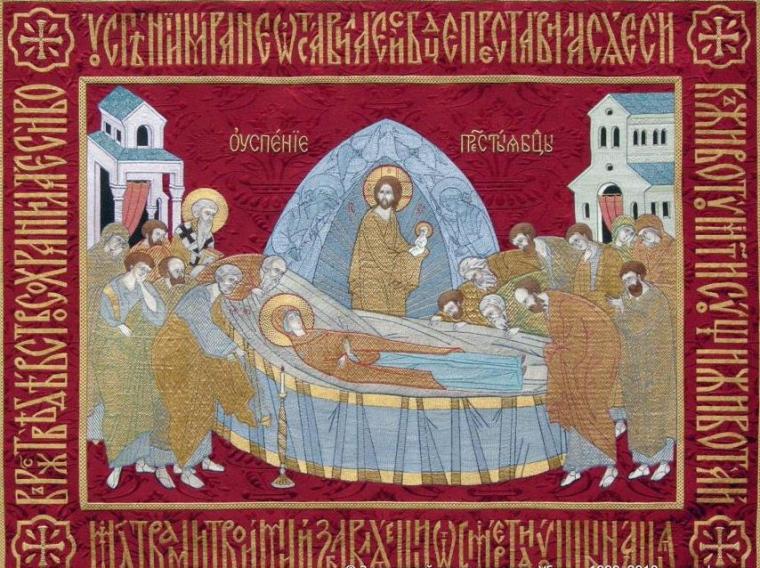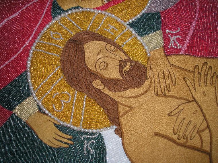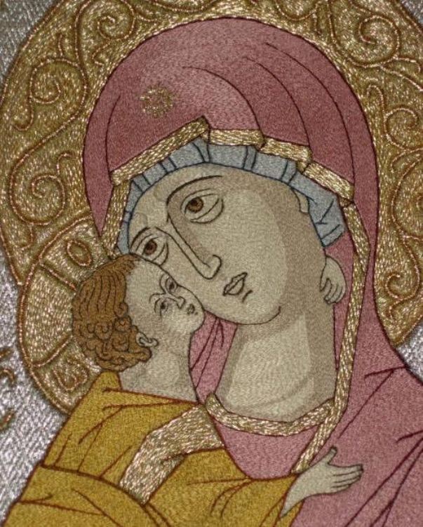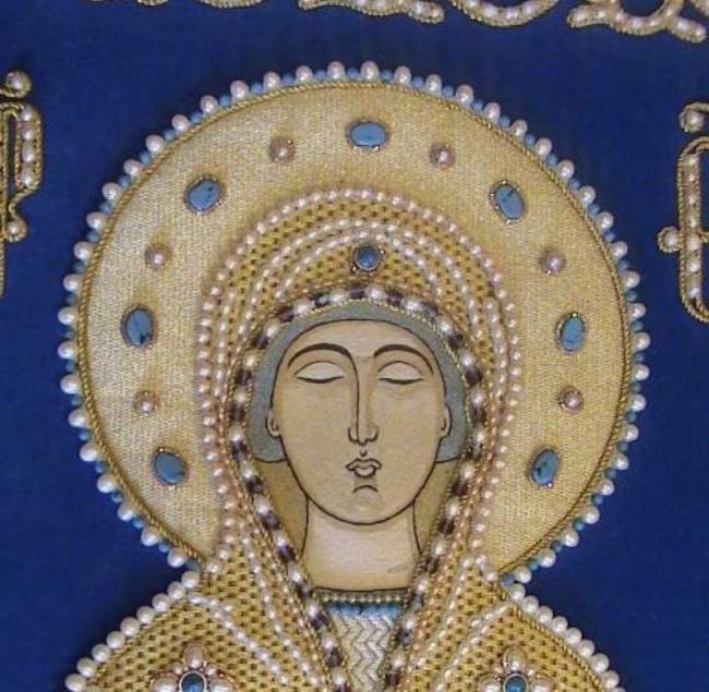 Чаще всего композиция произведения церковного шитья строится из центрального изображения - ликов святых, сцен из их жизни, библейских сюжетов, обрамленных каймой с аналогичными же рисунками или орнаментом в сочетании с вышитыми литургическими надписями.