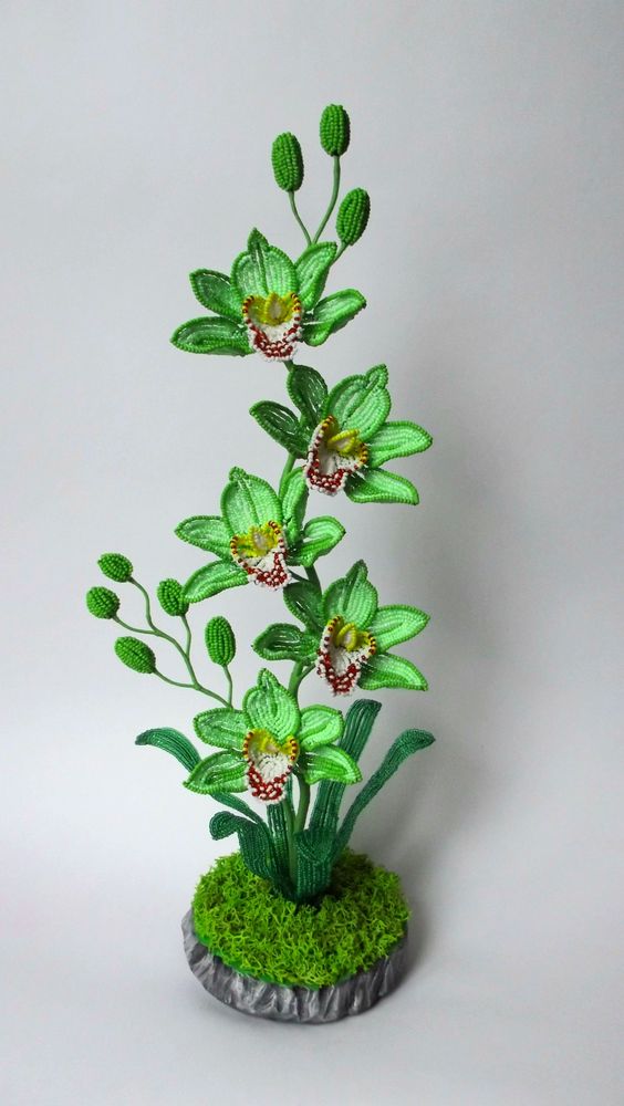 Такая необычная орхидея, выполненная из бисера зеленых оттенков, обязательно вызовет интерес гостей.