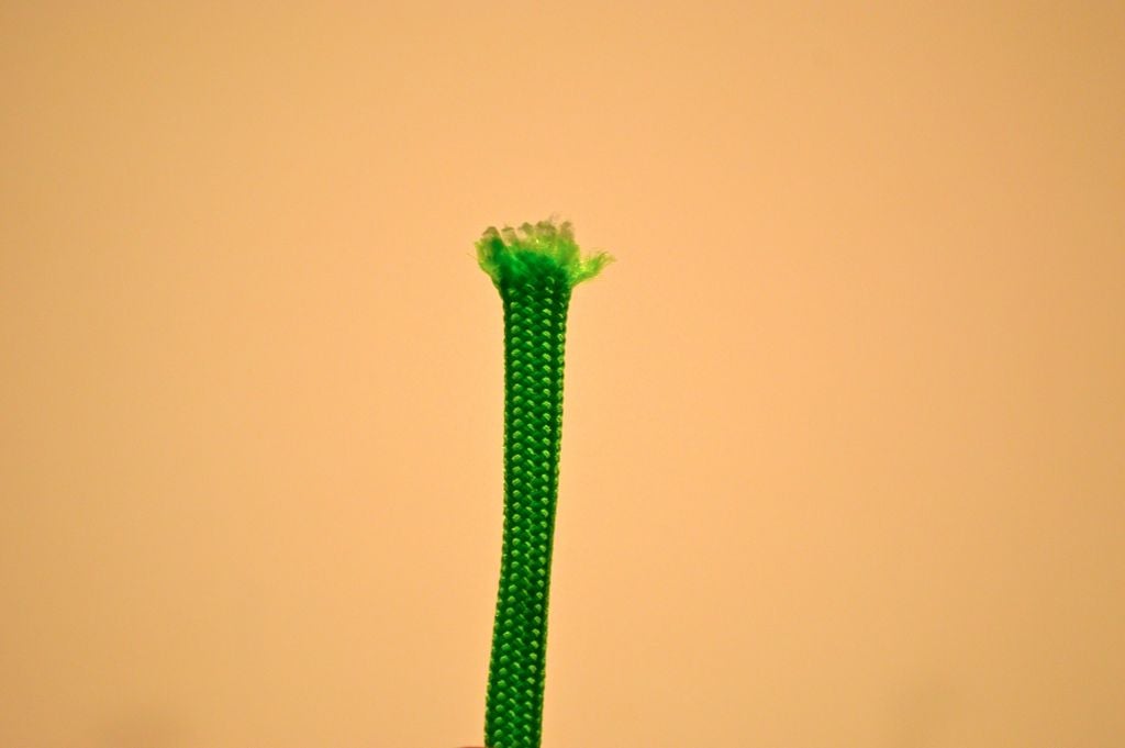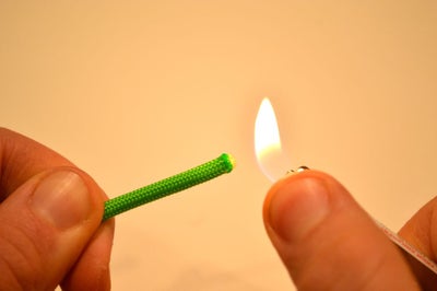 При отрезании куска паракорда его концы растрепываются и волокна расплетаются, если не оплавить концы. Удобнее всего это делать с помощью обыкновенной зажигалки. Зажгите ее и держите так, чтобы между ней и краем шнура было расстояние примерно 2 мм - чтобы края не горели, а плавились.
