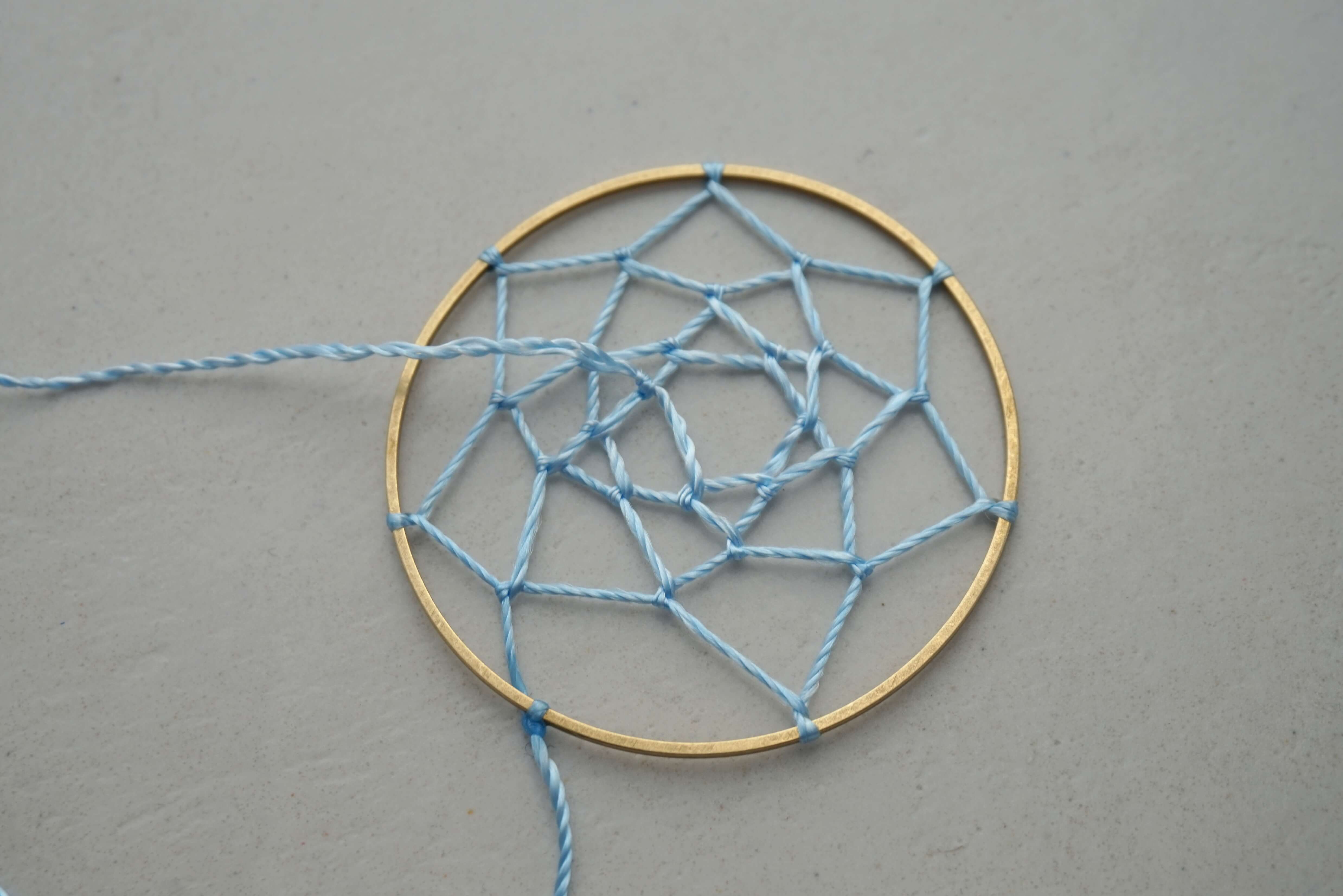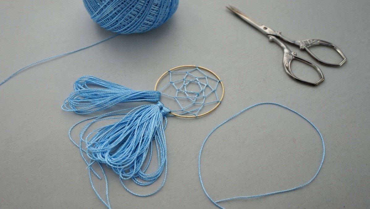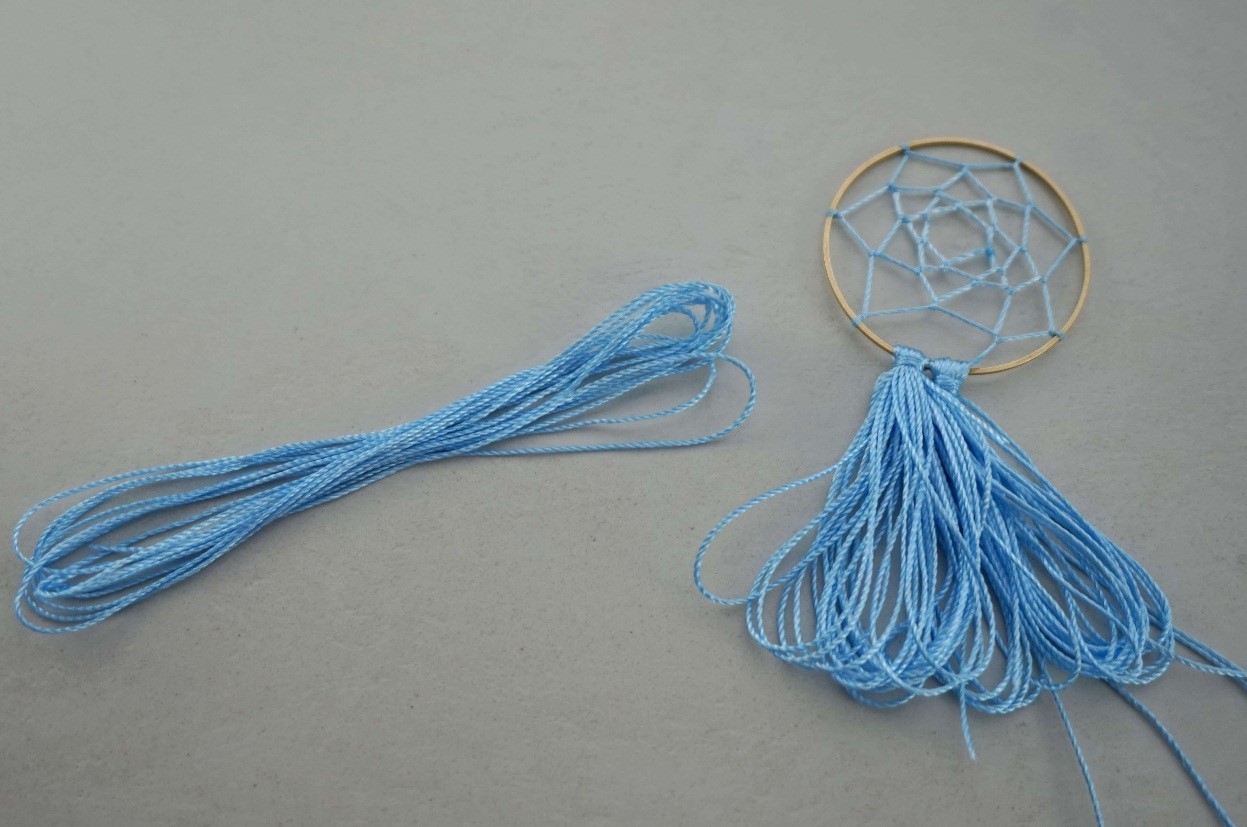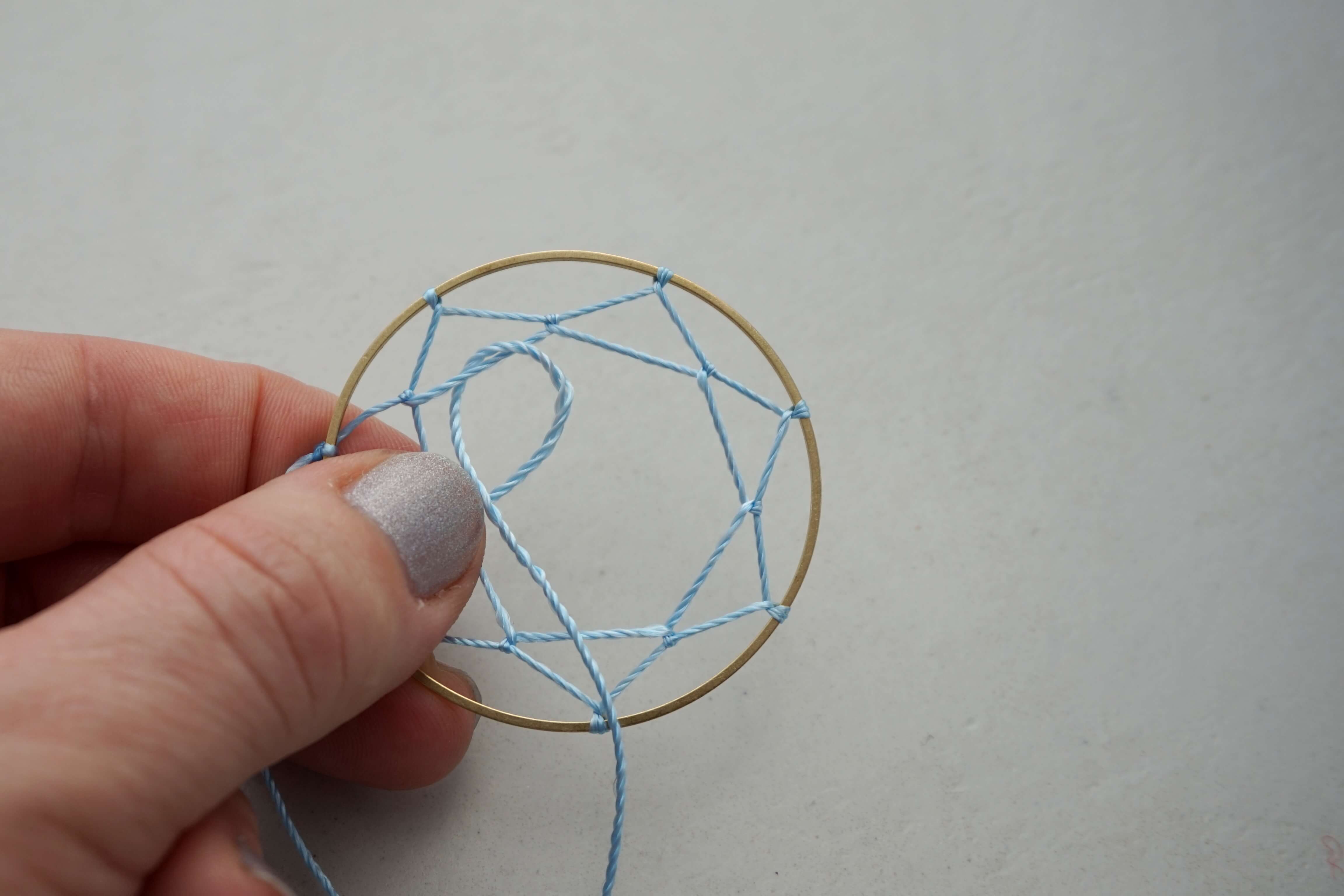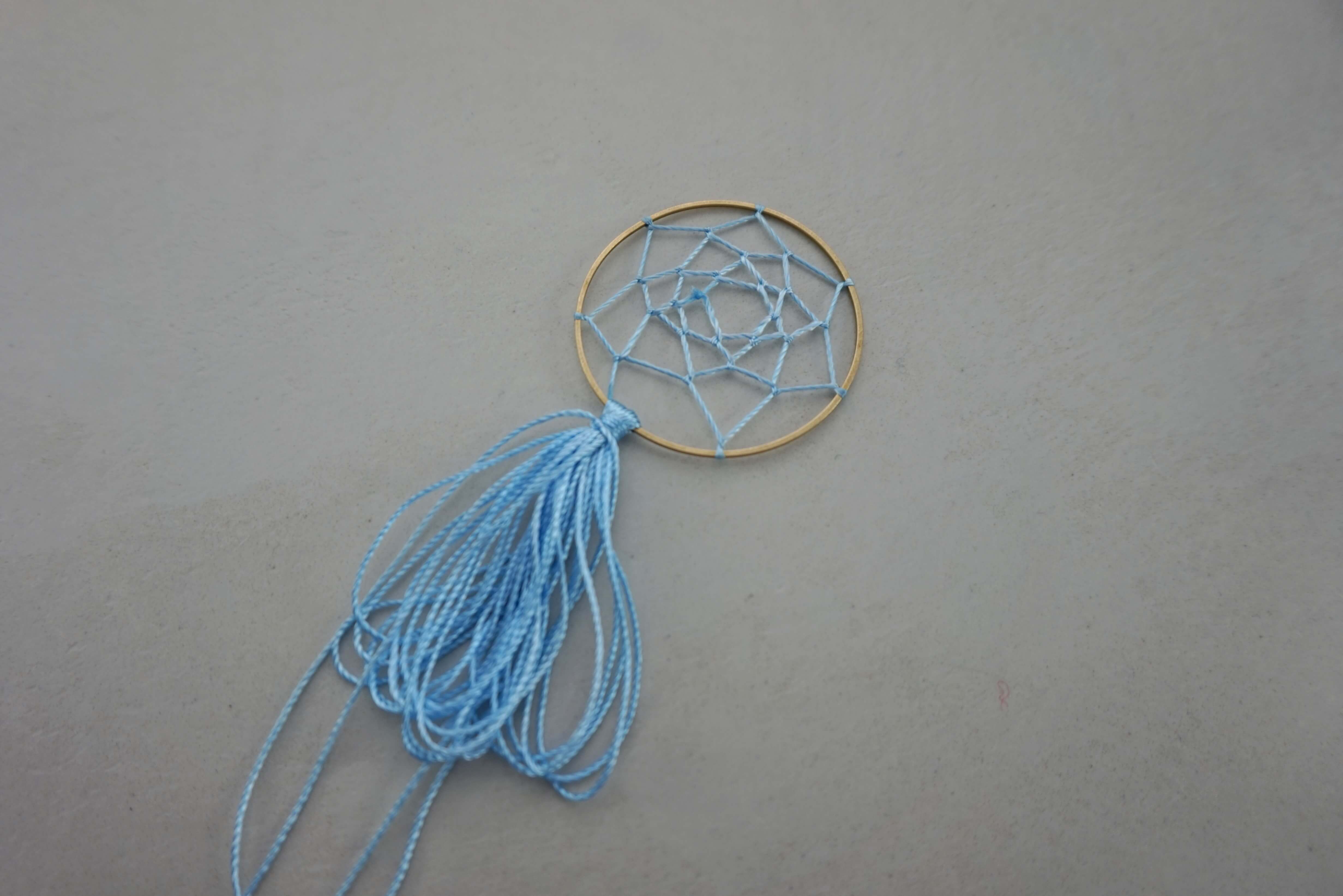 Когда вы доплетете паутину до центра обруча, завяжите последний узел и закрепите его для надежности капелькой клея.