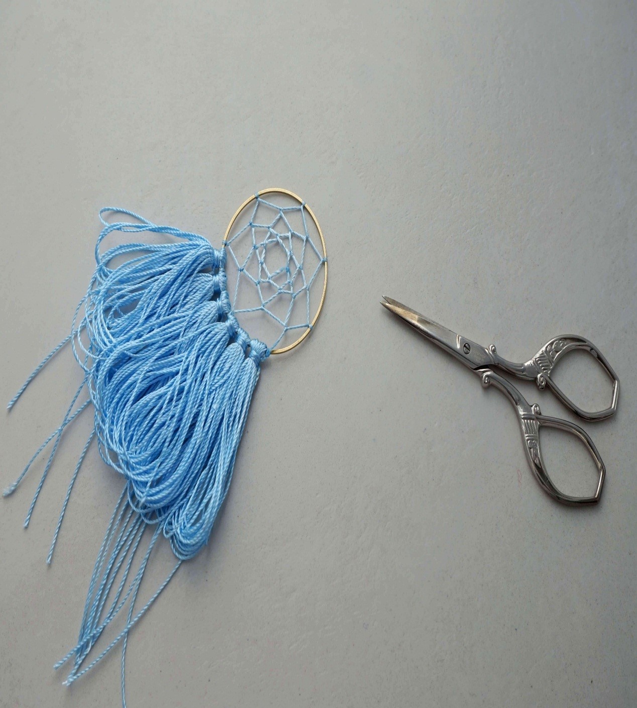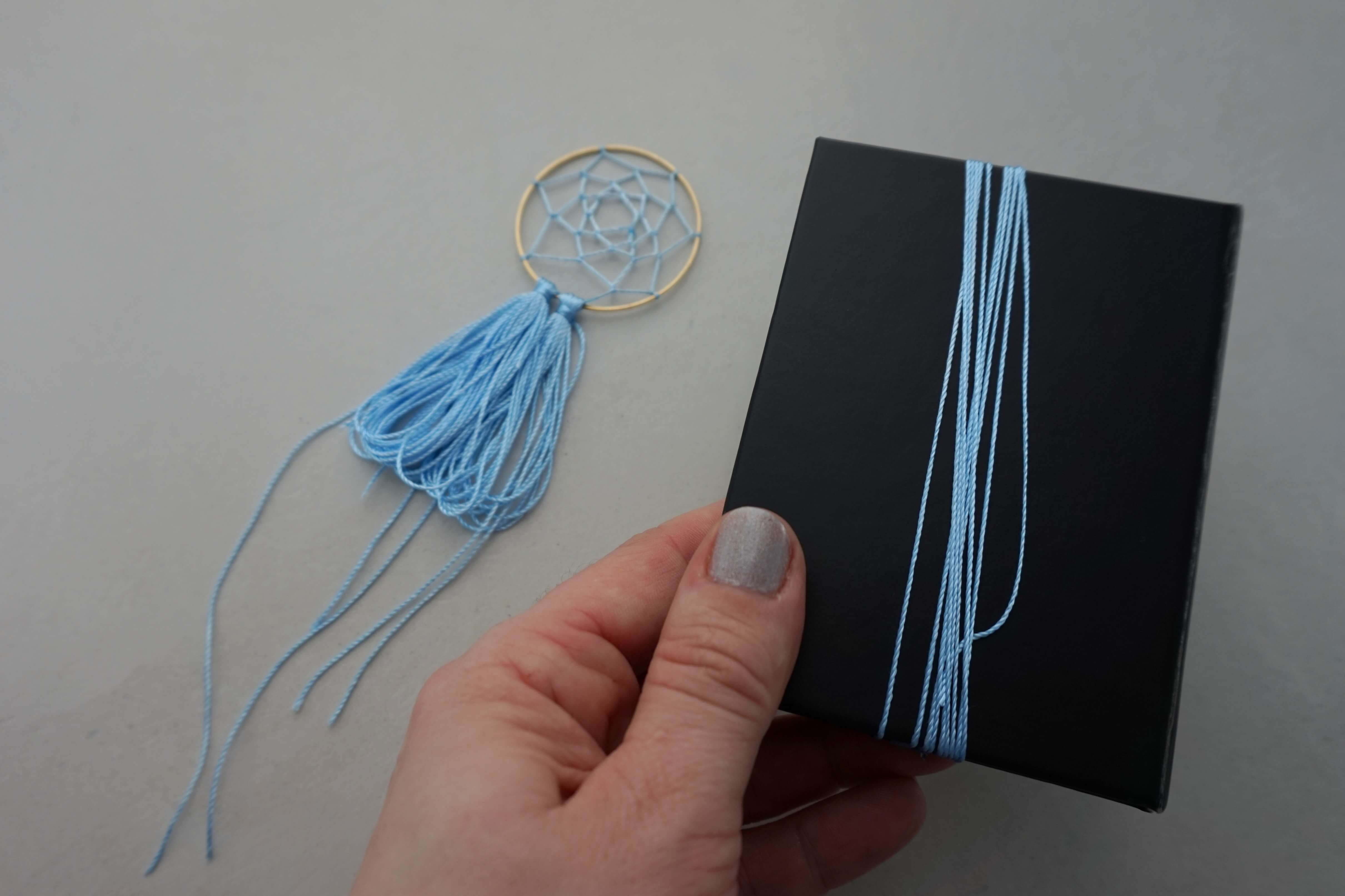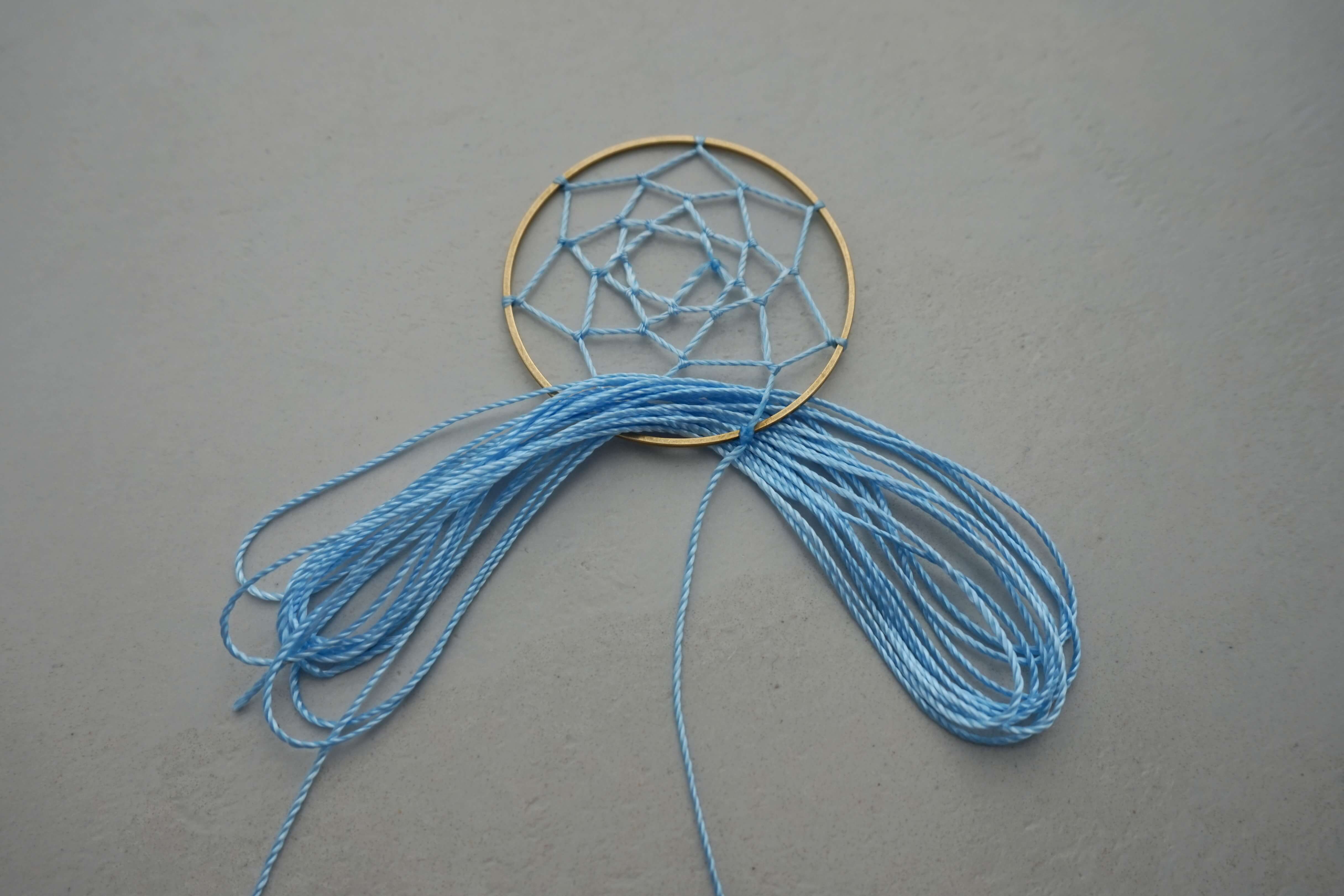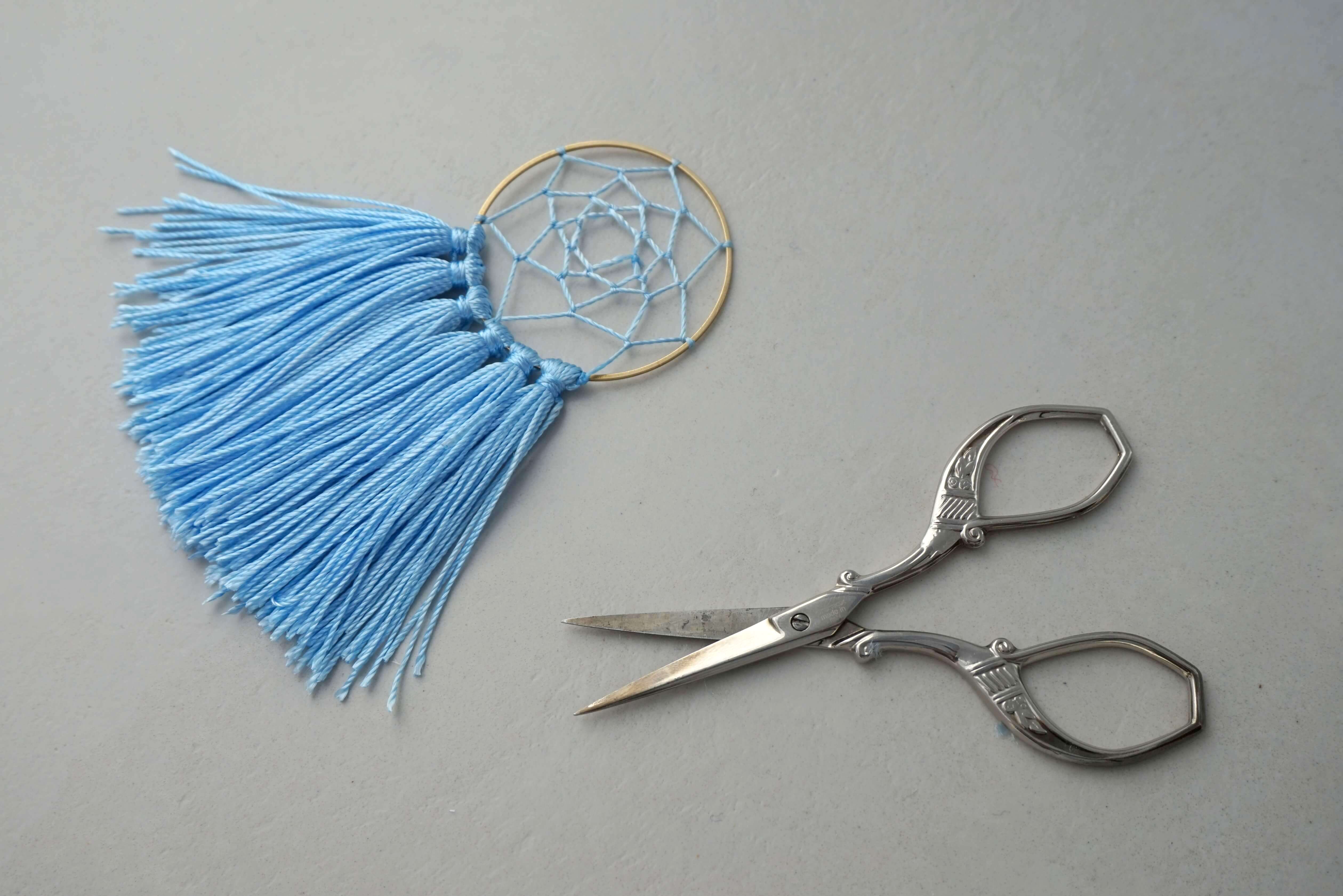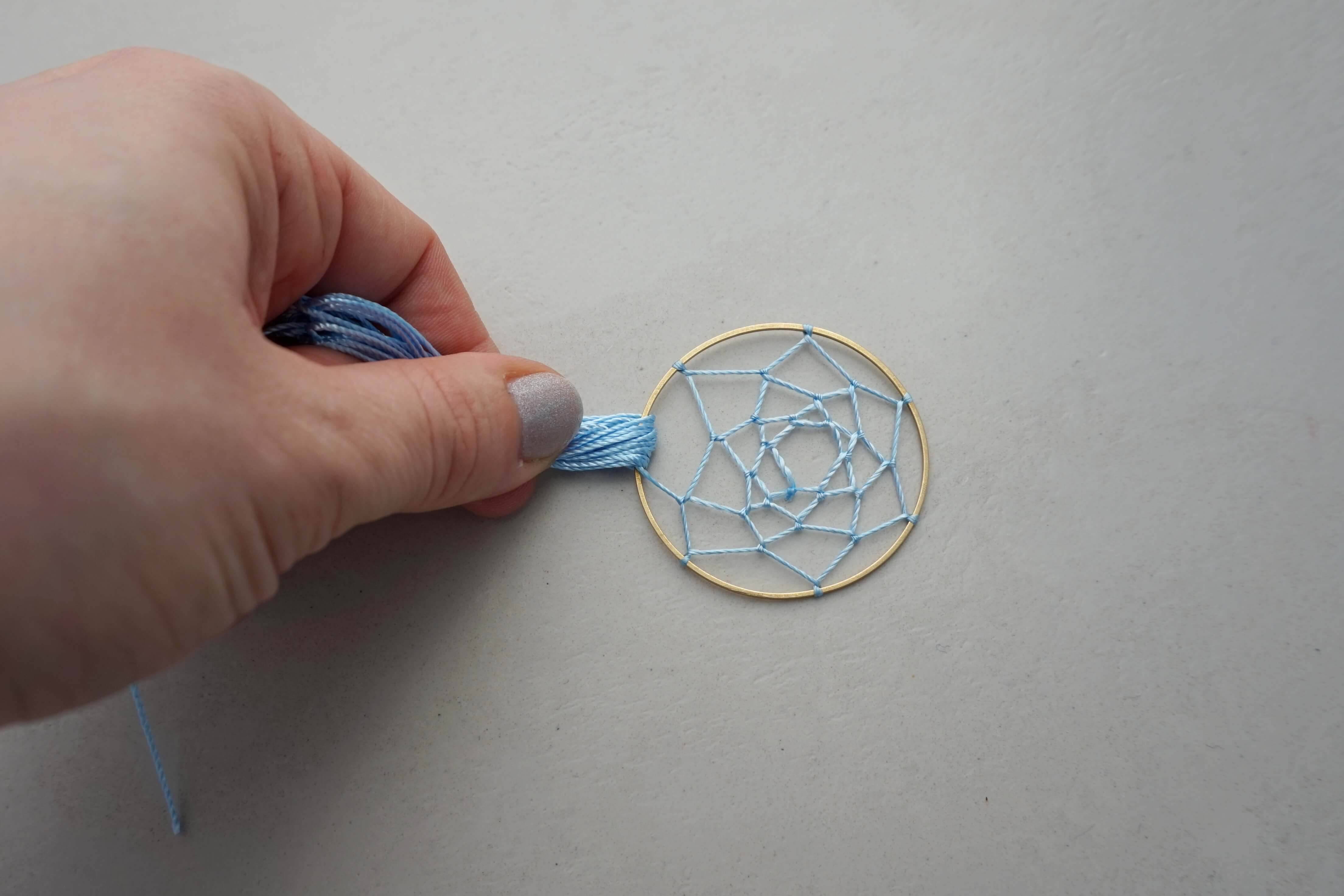 Когда вы доплетете паутину до центра обруча, завяжите последний узел и закрепите его для надежности капелькой клея.