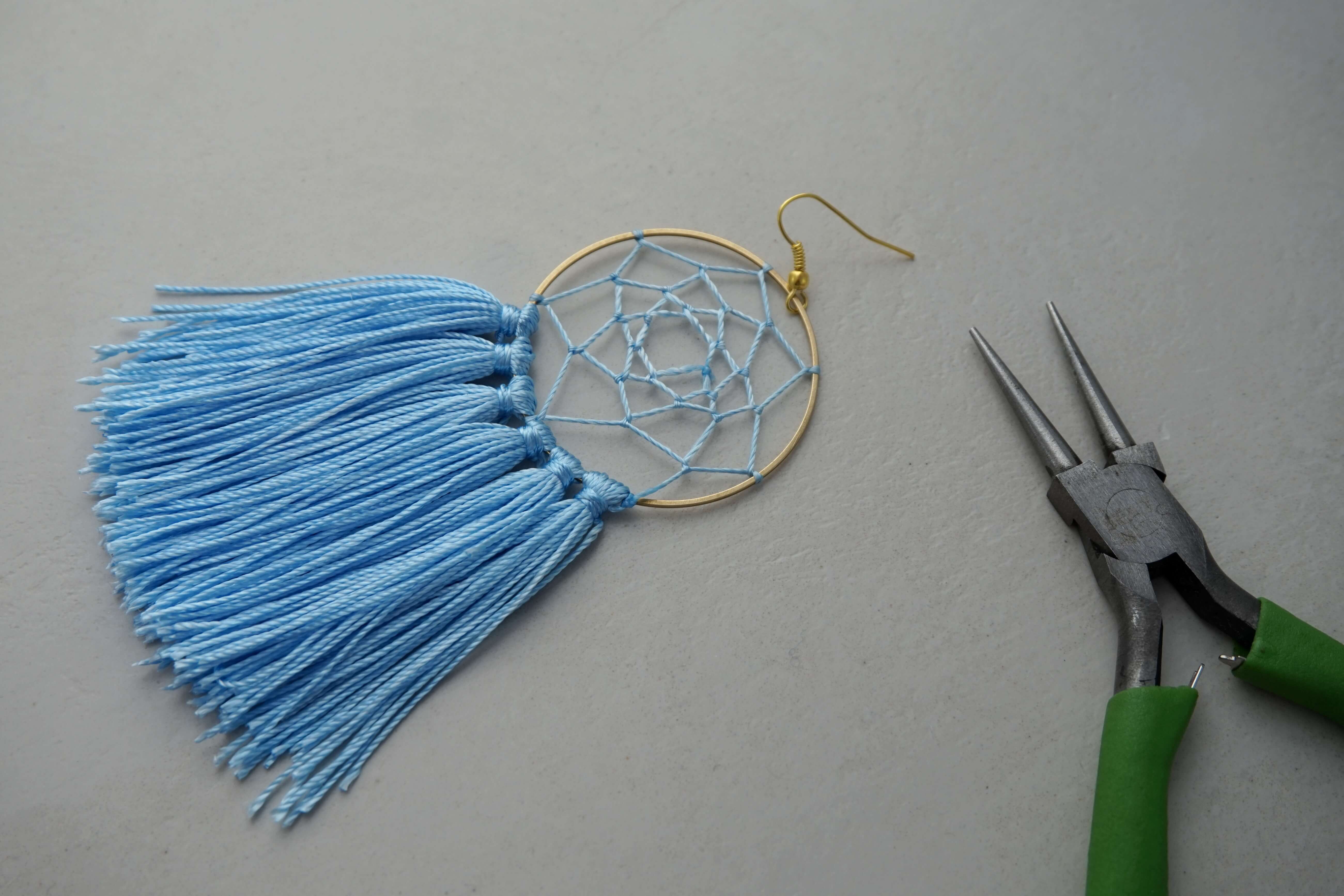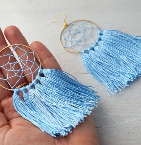 Теперь ваши сережки «Ловец снов» готовы. Если вы использовали обруч меньшего диаметра, можете добавить на него только кисточки. А еще мы рекомендуем использовать гексагональную основу - она выглядит потрясающе только с кисточками.