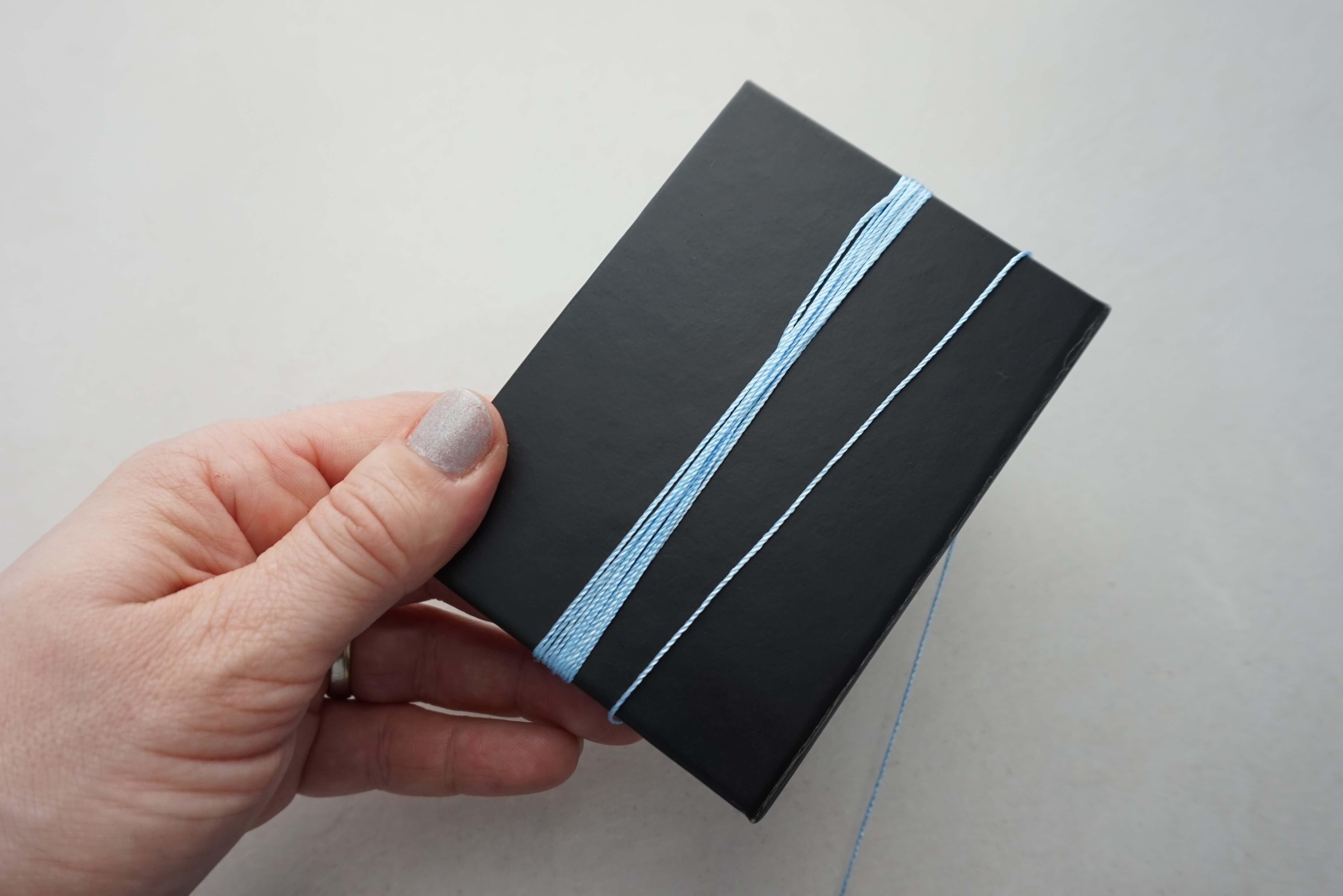 Осторожно снимите намотанные нити с картона, не смещая их положение при намотке. Подготовьте новый отрезок нити около 10 см в длину.