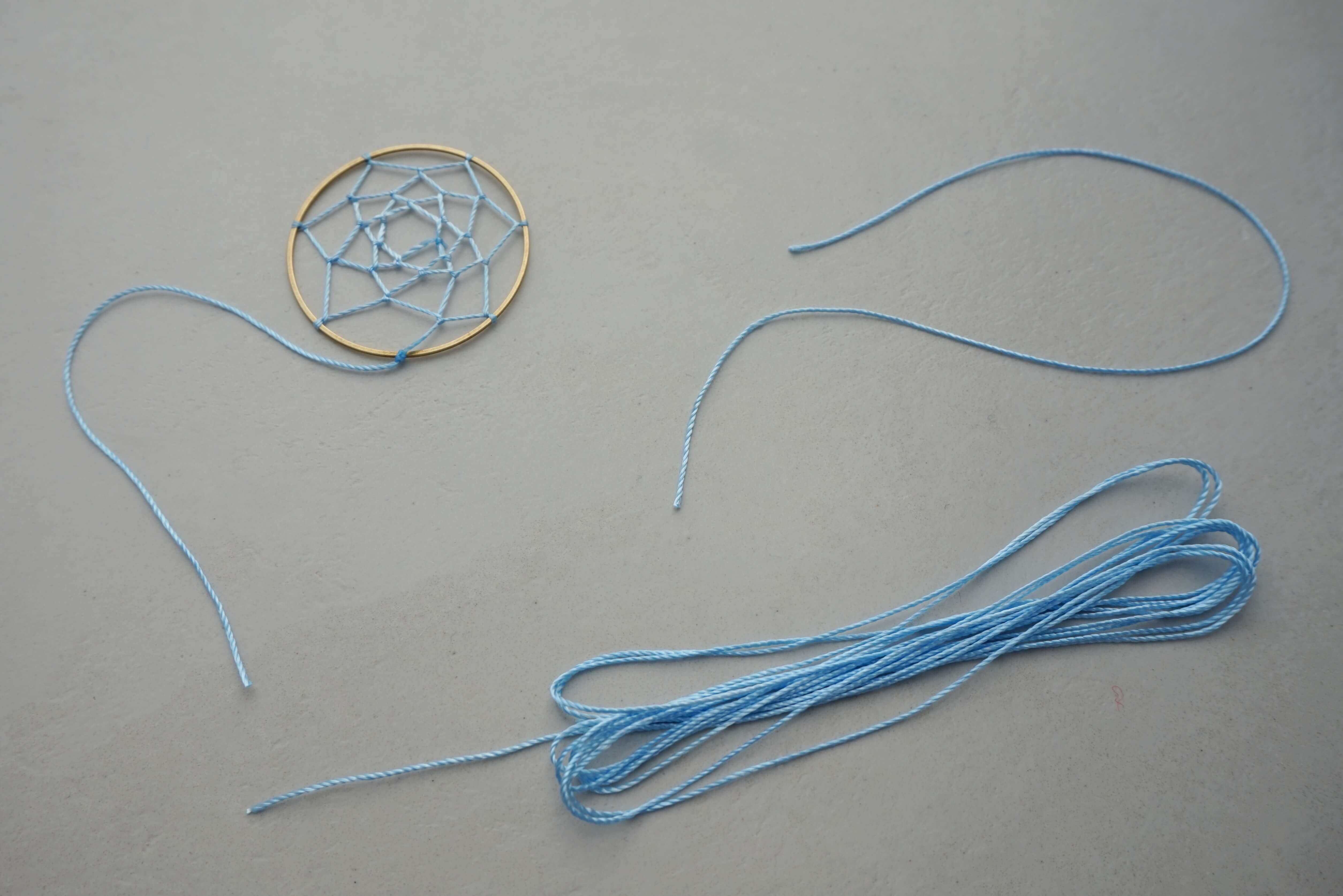 Подготовьте зубную нить длиной 1 м, крепко привяжите ее к обручу, оставив хвост длиной около 5 см. Если вы используете такую же прелестную нить, что и мы, рекомендуем нанести немного быстросохнущего клея на узел. Но только небольшое количество. Клей с кисточкой был бы лучшим вариантом для этого рукоделия.