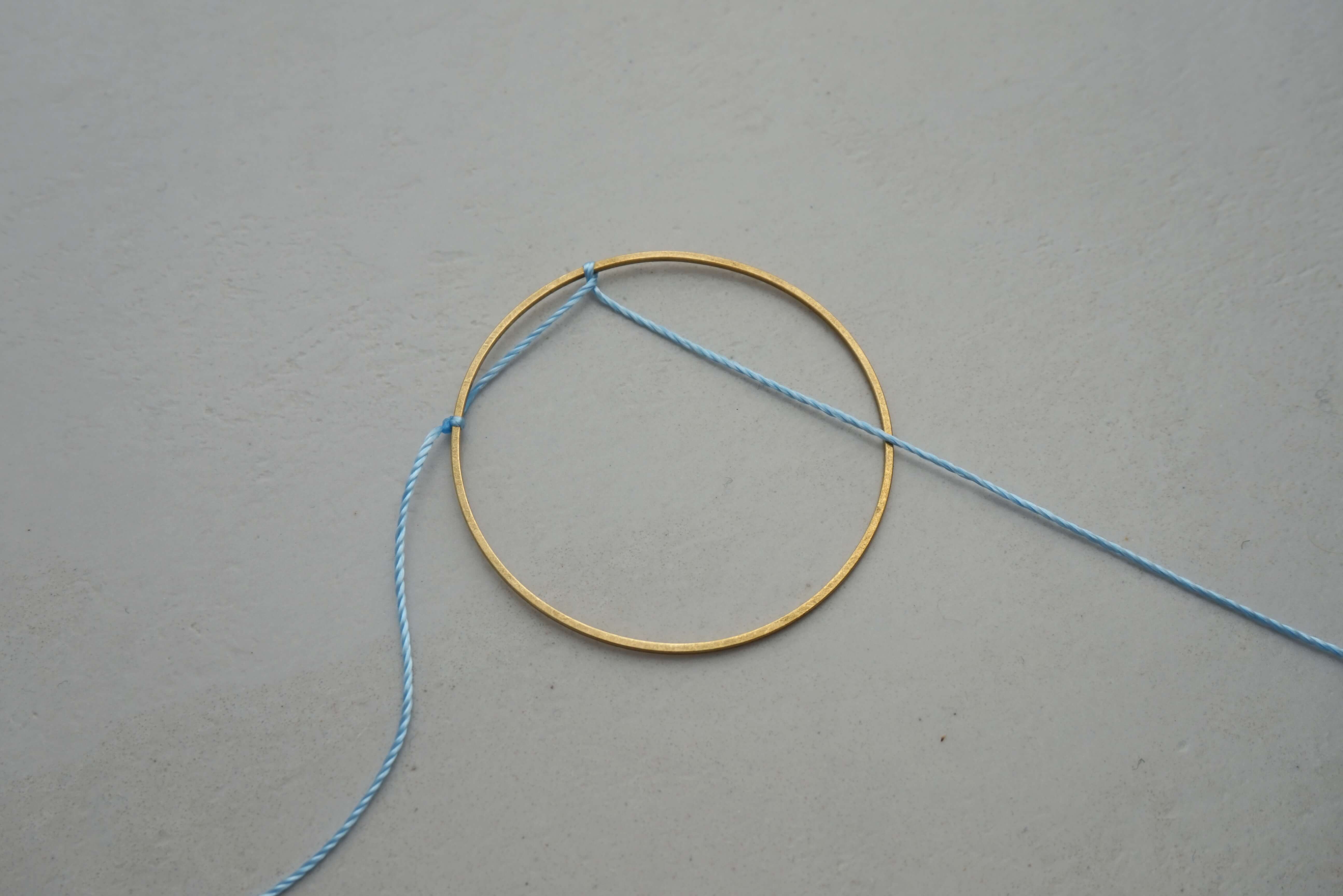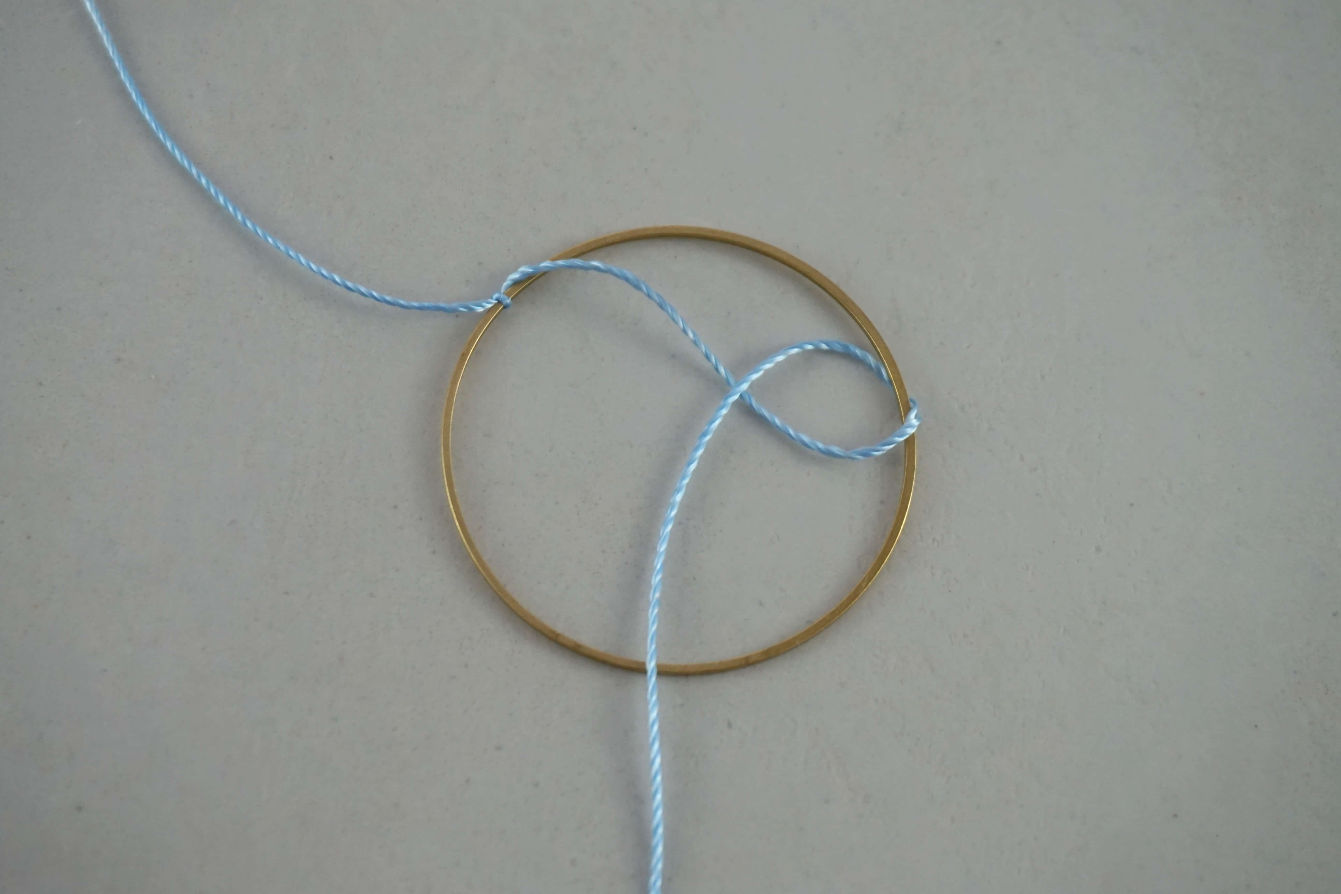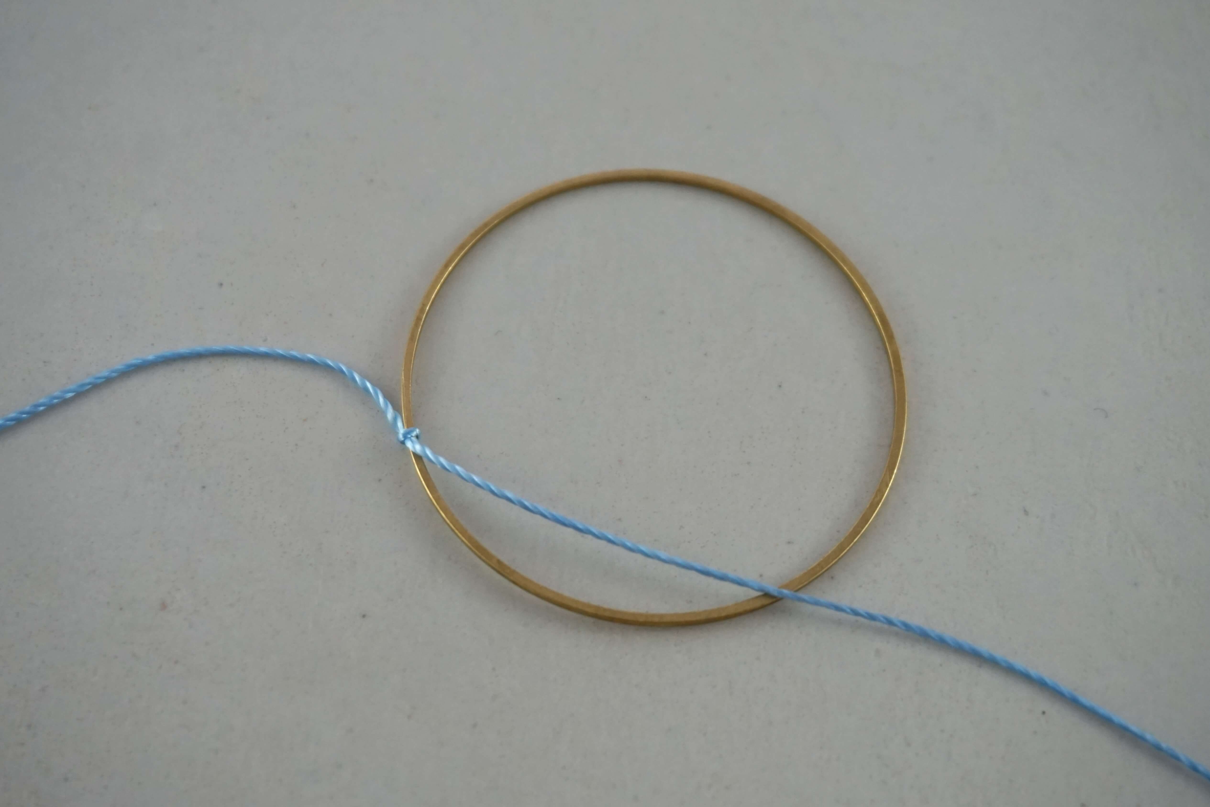 Завяжите узловую петлю на обруче. Поместите нить поверх кольца, затем переместите ее вокруг проволоки, образуя отверстие. Этот этап хорошо виден на фото.
