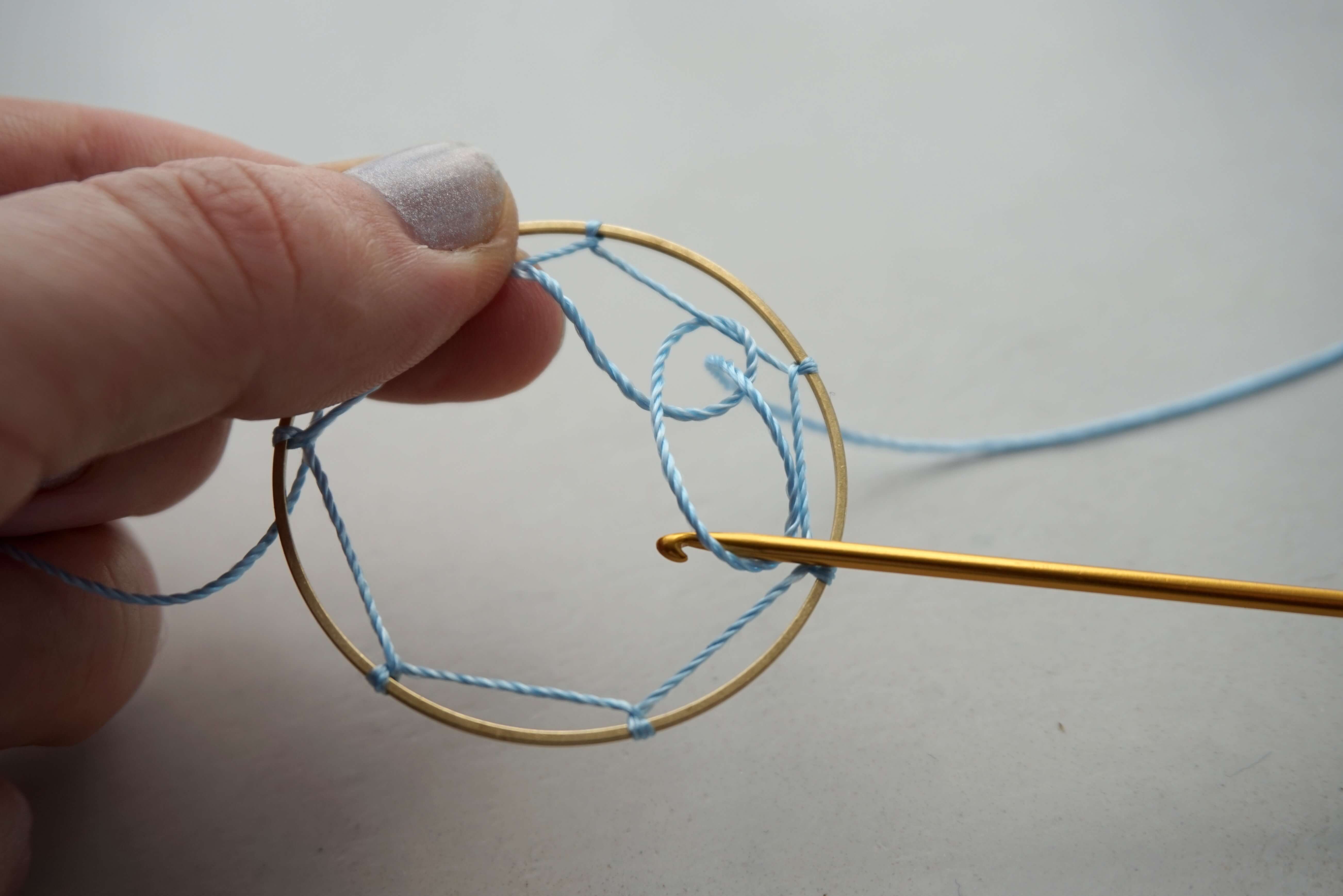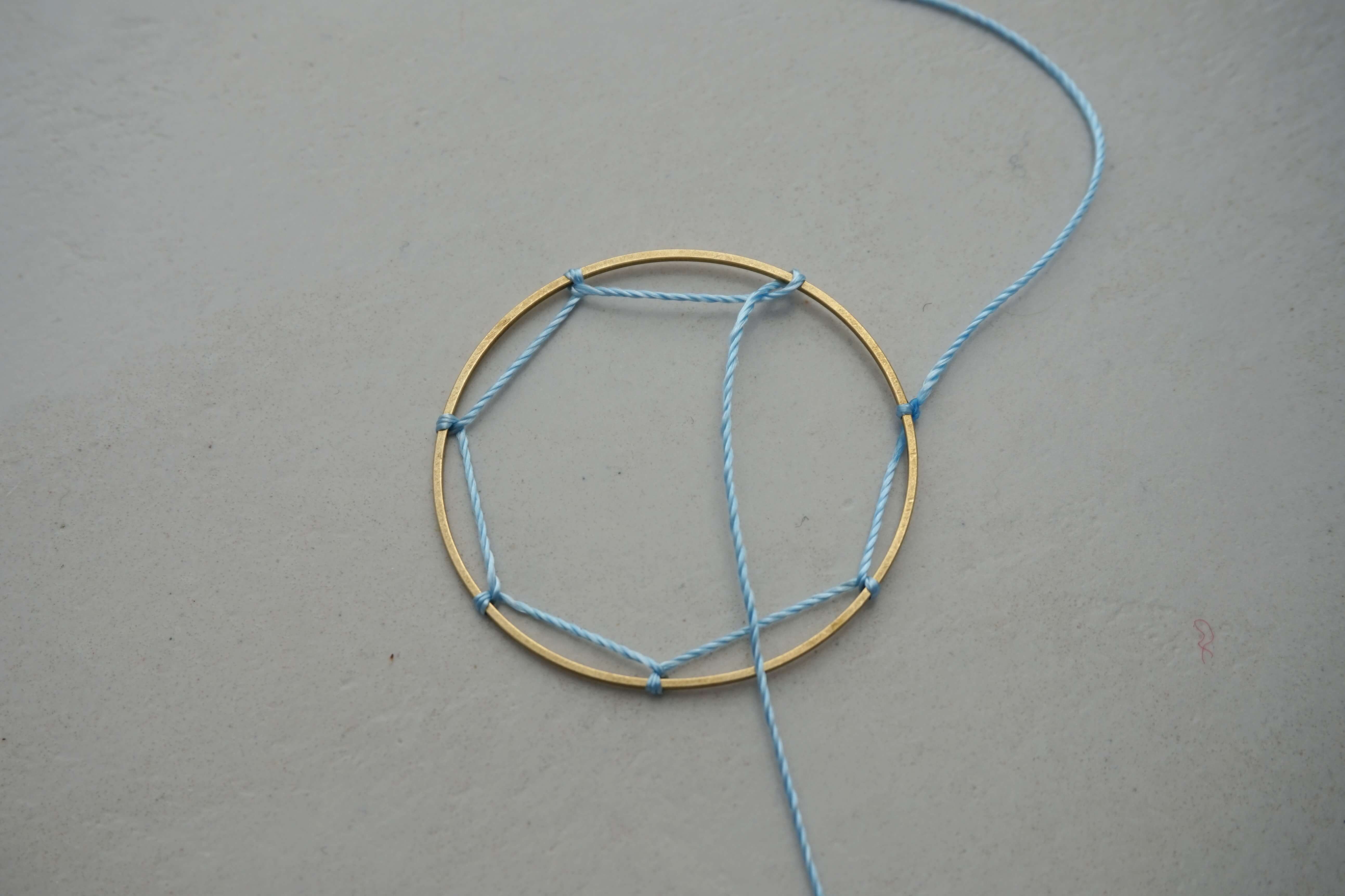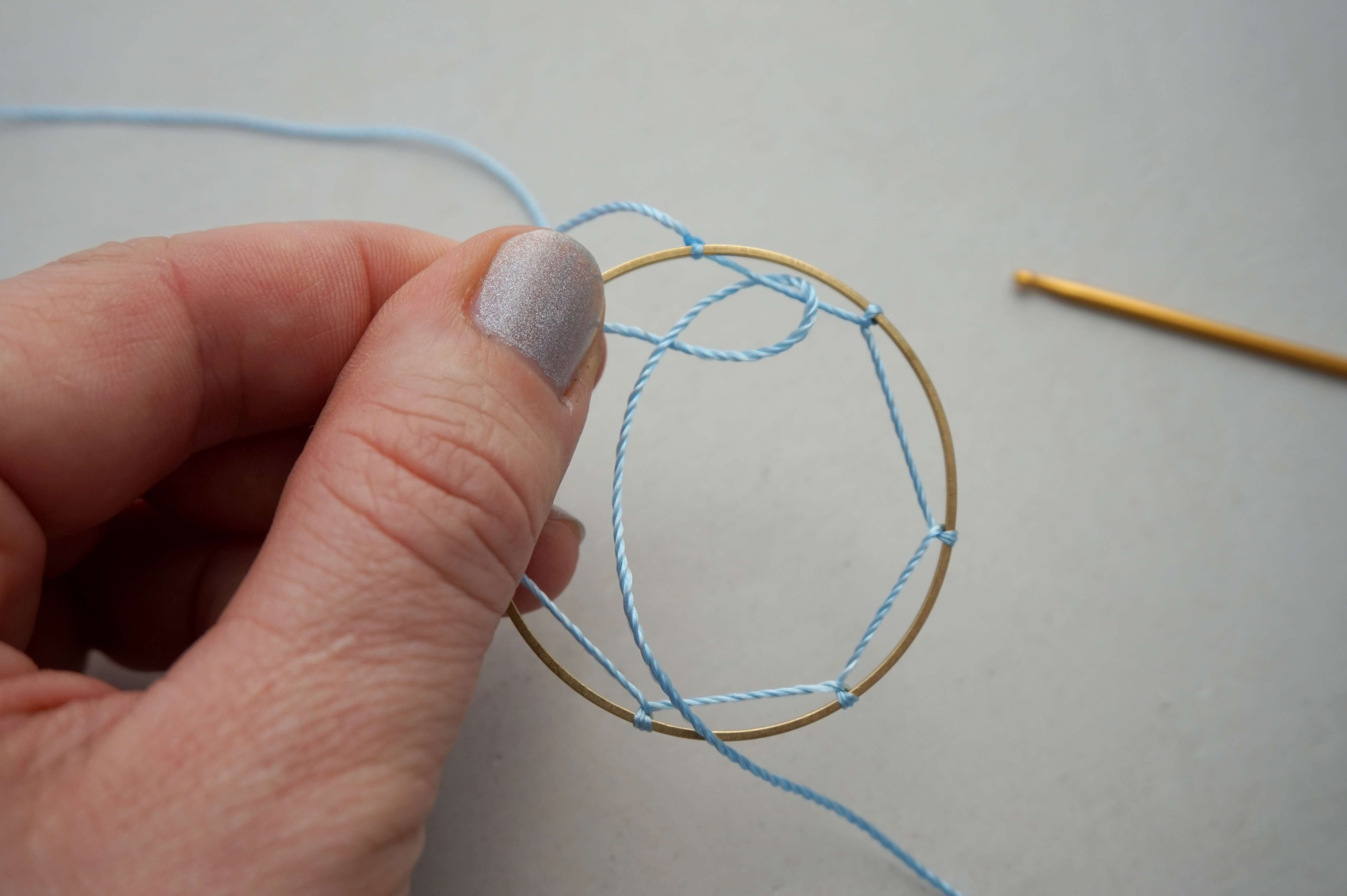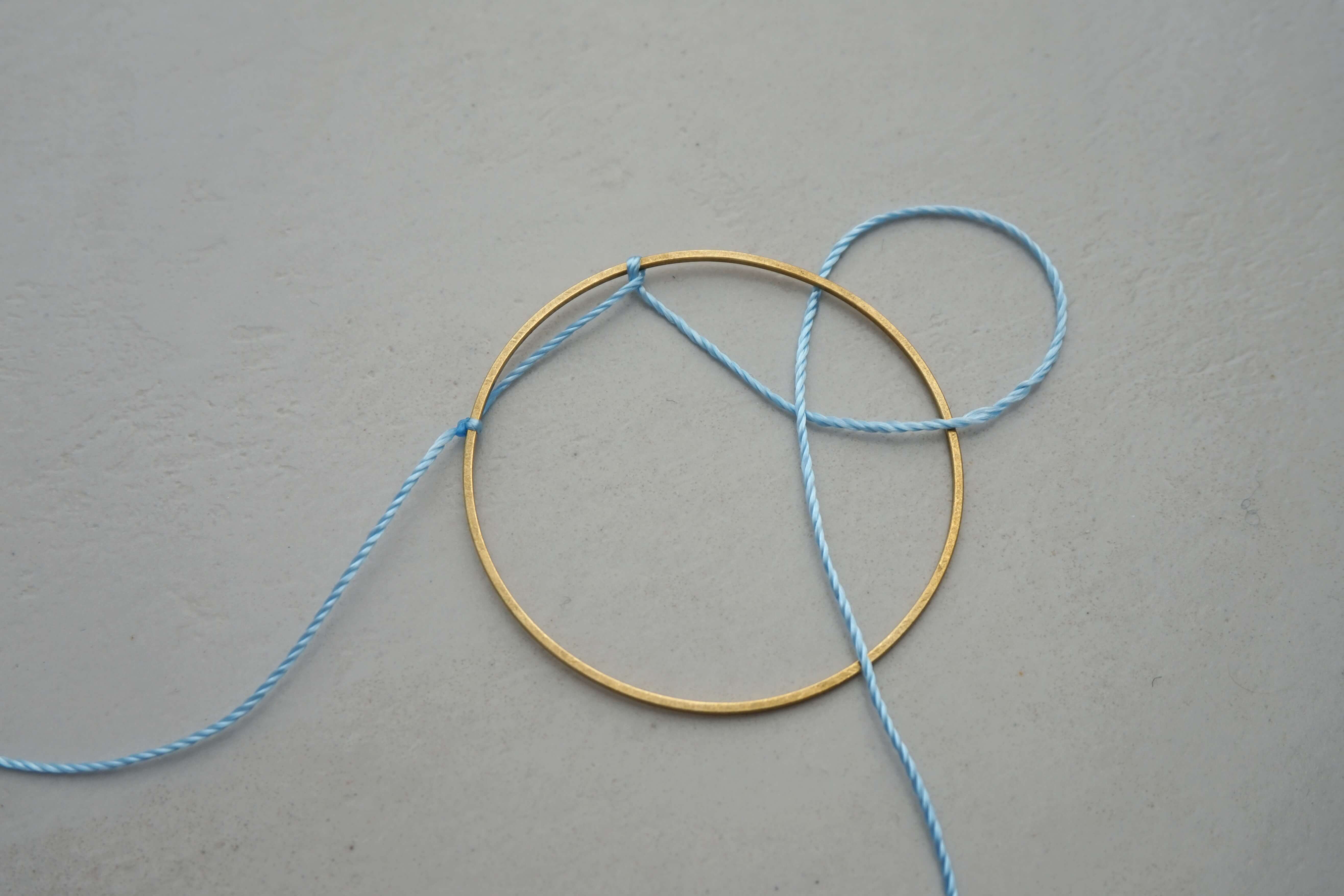 Завяжите узловую петлю на обруче. Поместите нить поверх кольца, затем переместите ее вокруг проволоки, образуя отверстие. Этот этап хорошо виден на фото.
