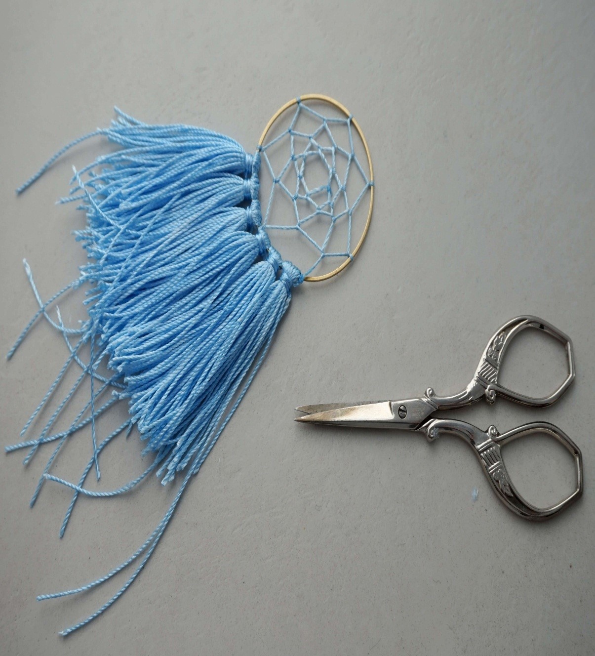 Кисточки, легкие пастельные тона – чувствуете ли вы лето? Если вы любите носить летом большие серьги, чем больше, тем лучше, то у этих сережек есть важное преимущество: они легкие. Надеемся, что вы влюбитесь в геометрические основы, с помощью которых они создаются. Используя их, вы можете сделать большие, уникальные серьги, и это не так сложно, как может показаться. Сегодня вы узнаете, как сделать сережки в виде амулета «Ловец снов». Вы также узнаете, как делать кисточки и прикреплять их к обручу.