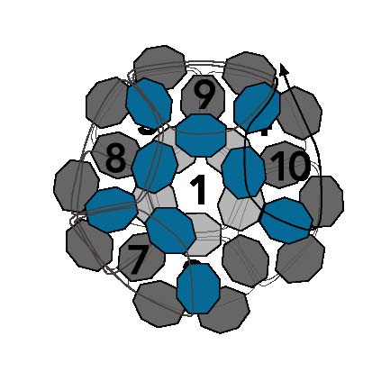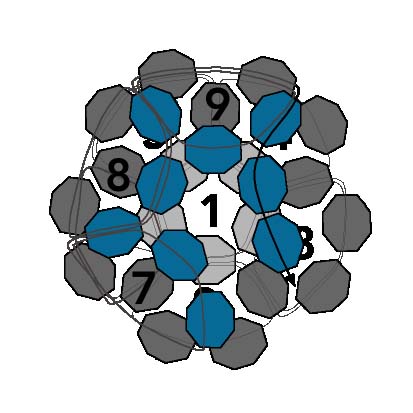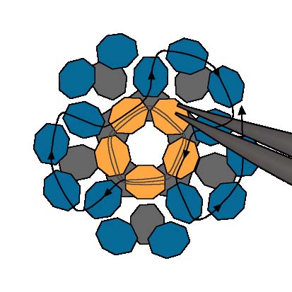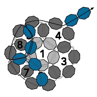 14. Проведите иголку в две последние бесцветные бусинки из числа четырех только что добавленных. Игла направляется сверху вниз и замыкает новый круг.