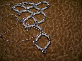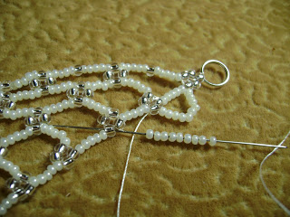 27. Добавьте 5 бежевых бусин, 3 хрустальные, еще 5 бежевых и 4 хрустальные. Проведите иголку через 2 прозрачных бисерины из четырех последних набранных, направляетесь сверху вниз, чтобы замкнуть кольцо.