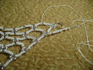 34. Далее добавляйте 5 бежевых и 4 бесцветные, ведите иголку через 2 хрустальные бусины из четырех только что набранных и замкните кольцо.