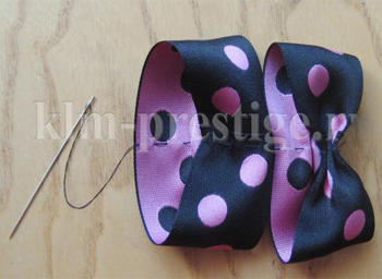4. Таким же способом и этой же ниткой прошейте вторую ленту. Потом затяните нить и обкрутите ею прошитое место несколько раз, после чего закрепите нитку. Первая часть нашего банта готова.