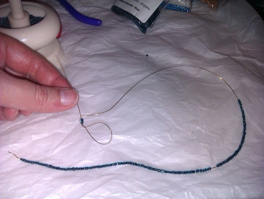 На длинный конец проволоки нанижите бисер. Скрутите на конце узелок, чтобы бисер не спадал с проволоки.