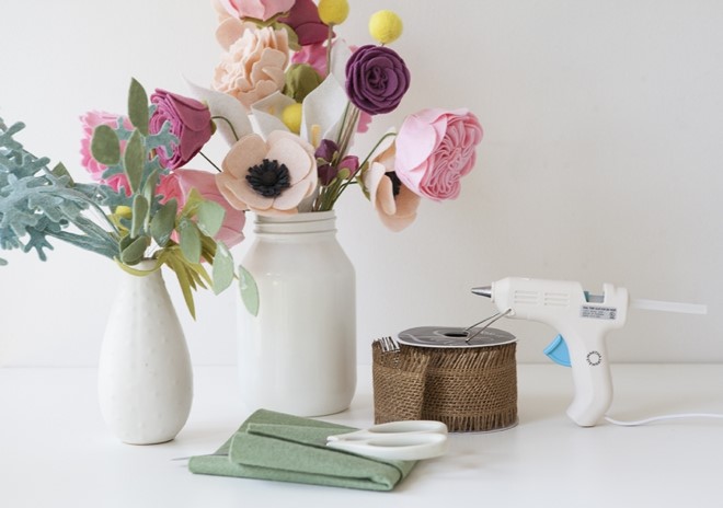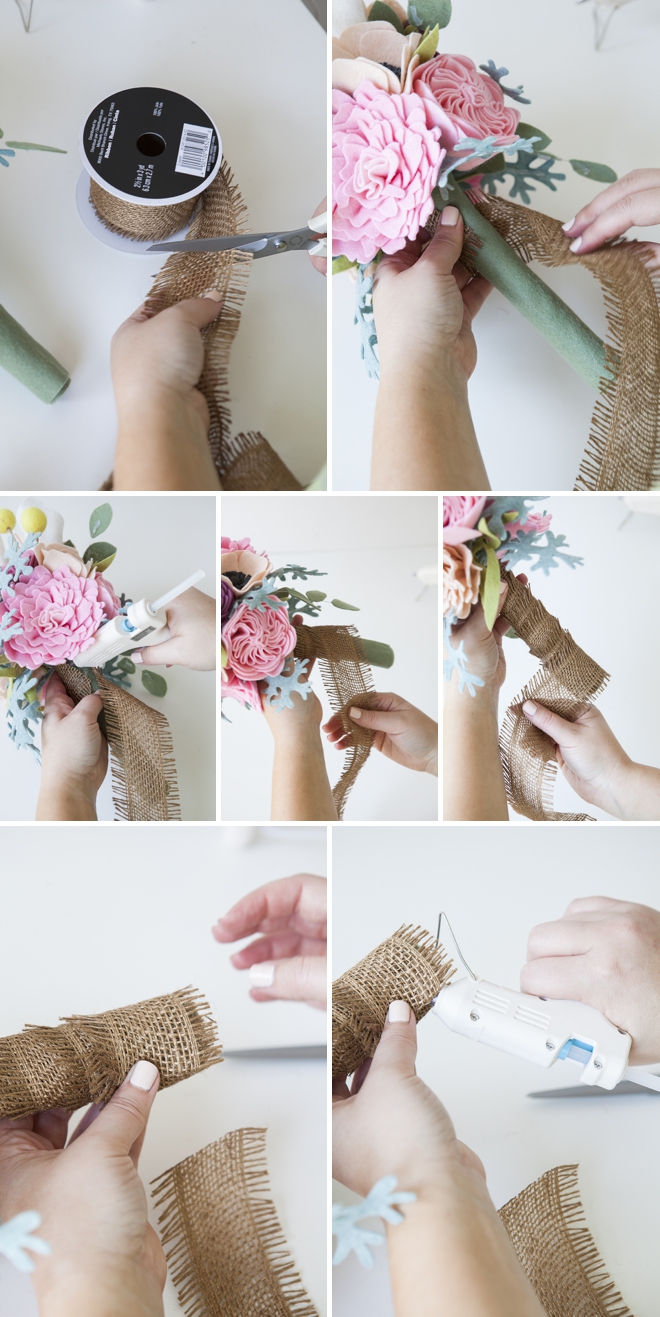 Покройте фетр горячим клеем и заверните стебли вашего букета в выбранную вами ленту.