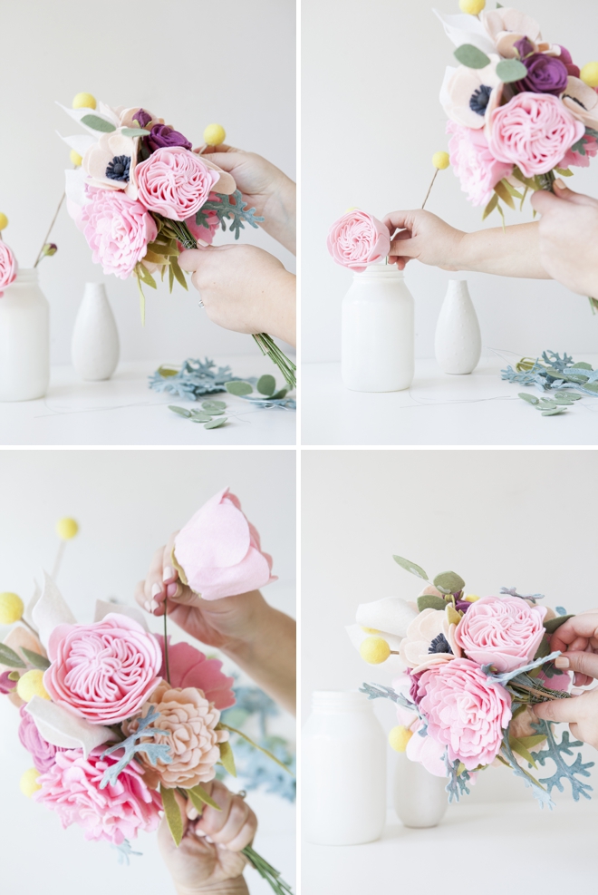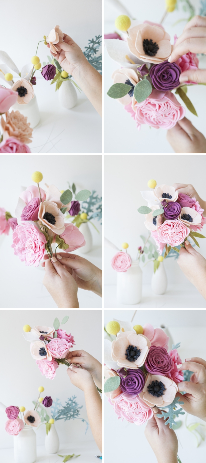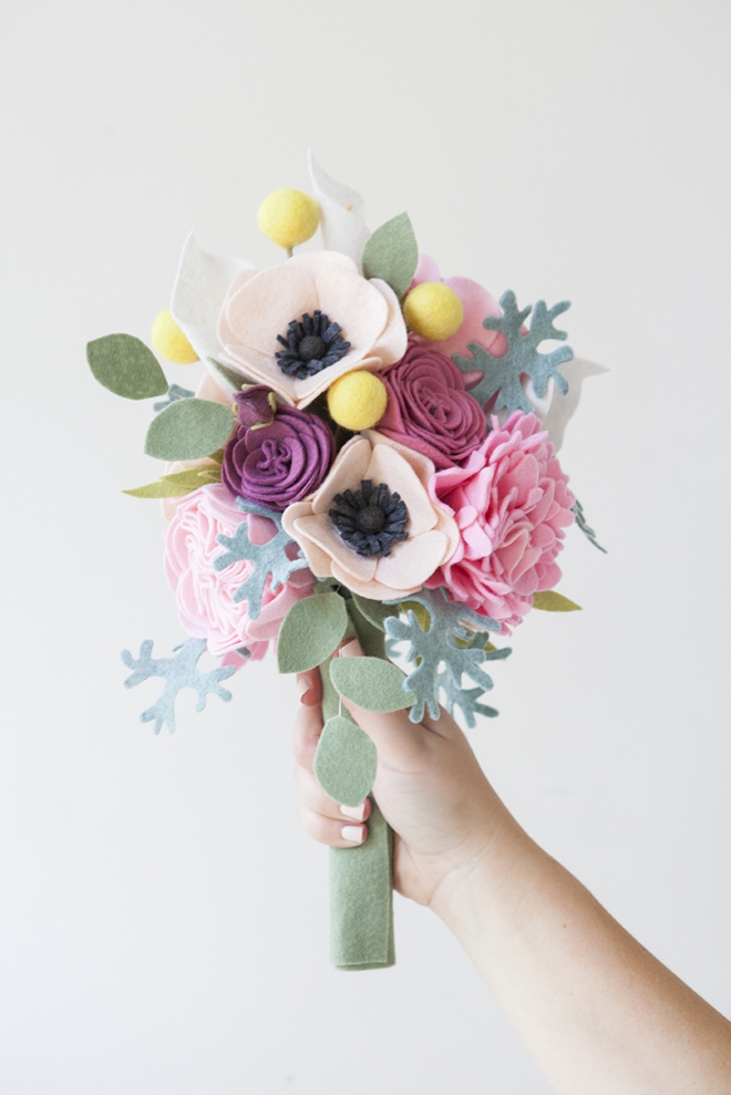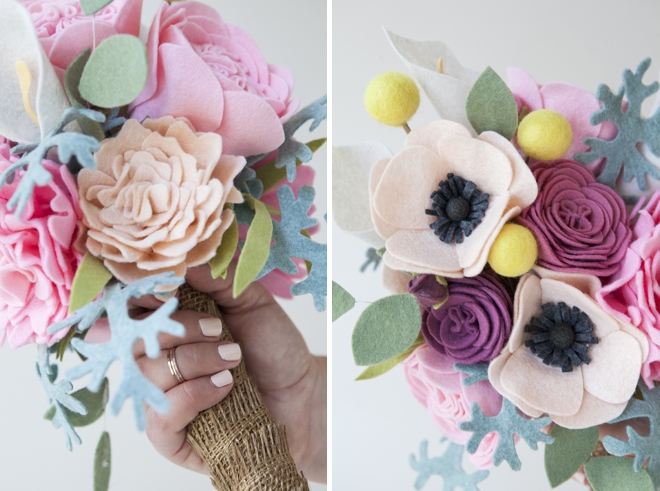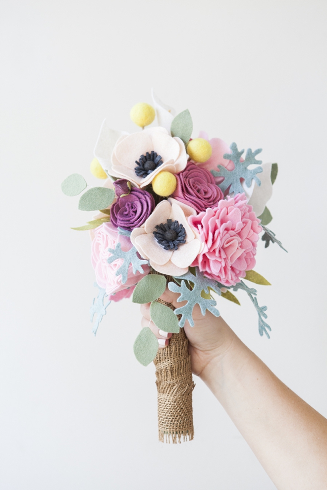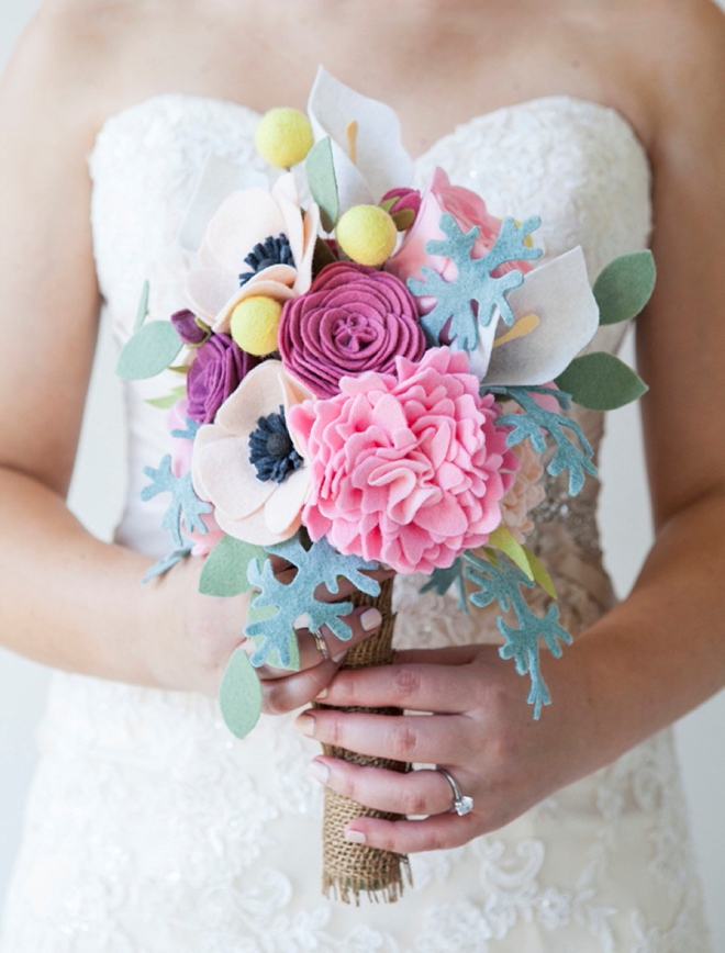 Такой войлочный букет идеально подойдет для любого праздника, даже для свадьбы.