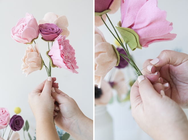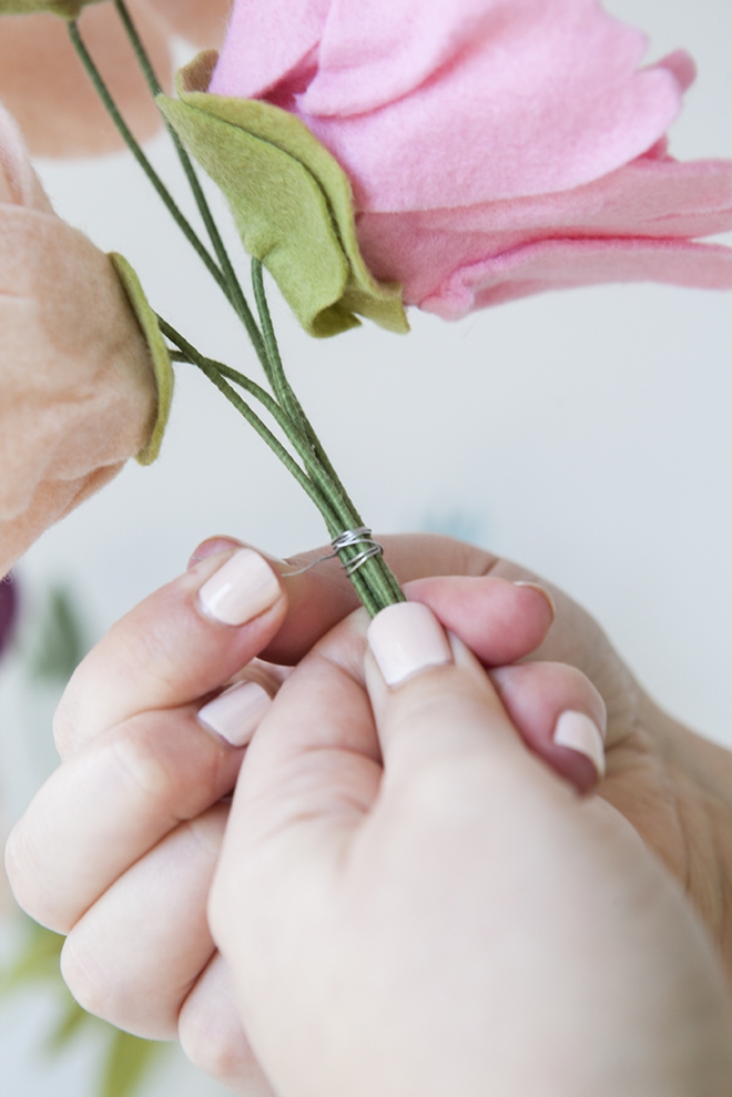Затем добавьте еще несколько цветков. От трех до пяти штук - идеальное количество. Потом снова оберните стебли проволокой.