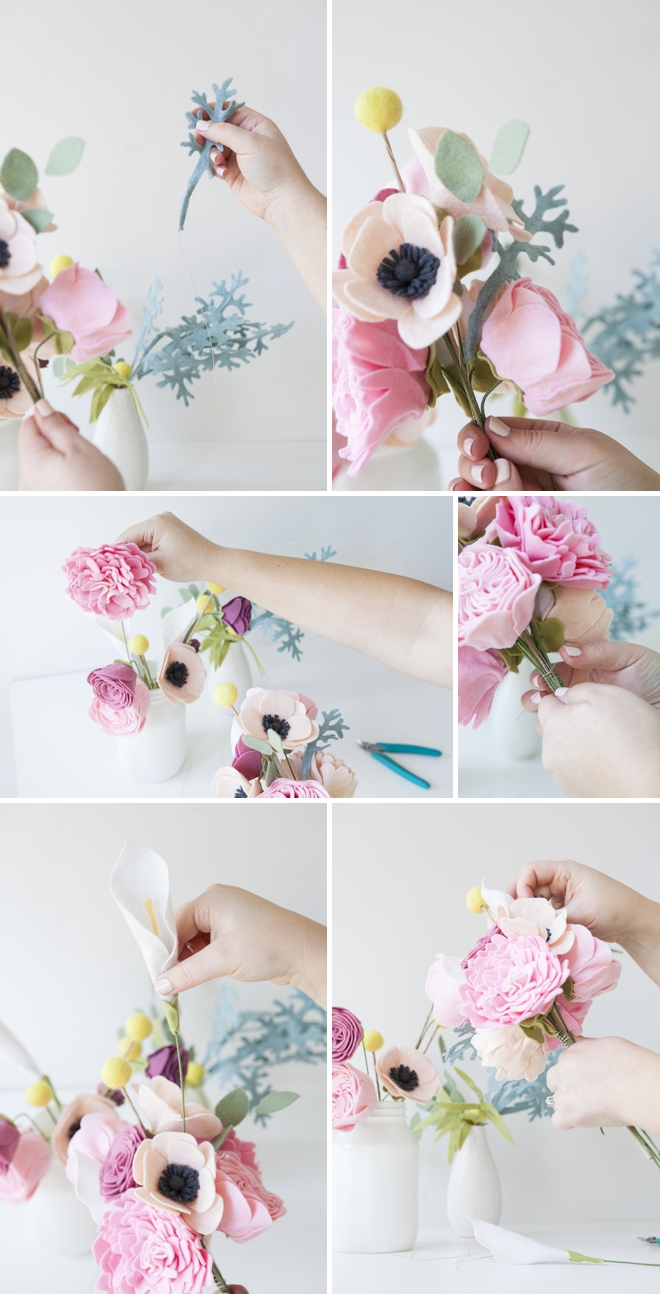 Фетровые цветы (мы выбрали пион, каллу, пыльная мельница, розу, листья эвкалипта, анемон, лютик и шарики Билли)