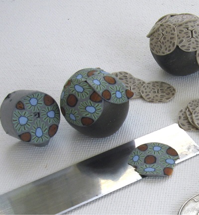2. При помощи тканевого лезвия нарежьте глиняные «колбаски» на тонкие ломтики. Приложите полученные ломтики так, чтобы покрыть сырые глиняные шарики (см. фото B), создавая пары по рисунку и размеру.