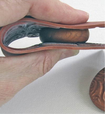3. Поместите глиняный шарик между сложенным штампом и осторожно нажмите, чтобы слегка разгладить глину (см. фото D). Проверьте, достаточно ли глубоким получился отпечаток. Если нет, снова раскатайте полимерную глину и повторите штамповку.