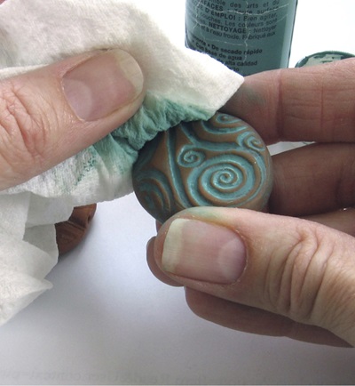 Смоченным бумажным полотенцем промокните большую часть краски с возвышающихся поверхностей бусин, оставив краску в углублениях (см. фото G).