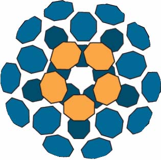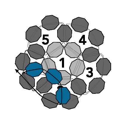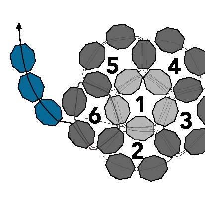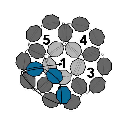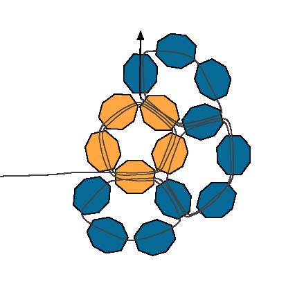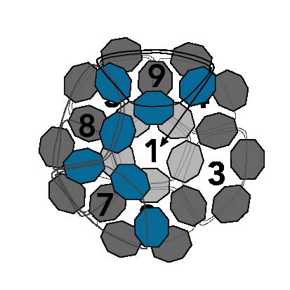 23. Первые шесть петель создают форму чашки с первой петлей внизу. Эти шесть петель показаны на схеме серым цветом и расположены за развивающимися рядами на диаграмме. Шесть петель создают первую половину круглого фуллерена, а следующие пять петель создадут вторую половину фуллерена, отклоняясь назад в противоположном направлении и образуя сферу.