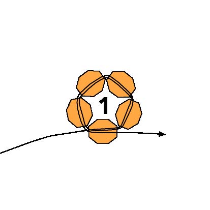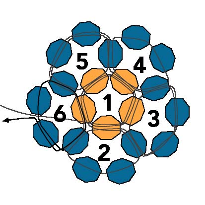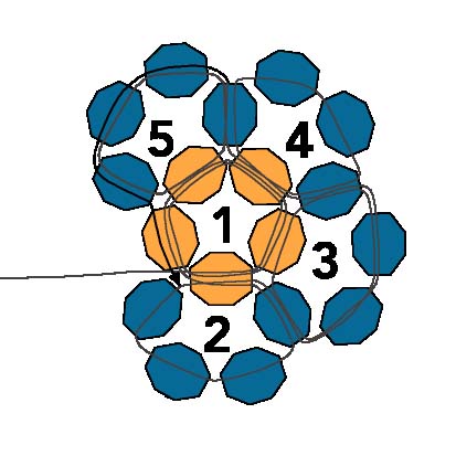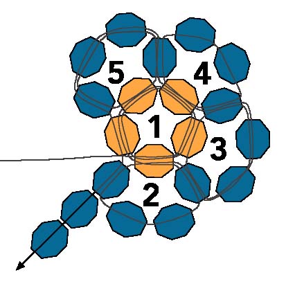2. После этого протяните иглу через первую бисеринку, создавая круг из пяти бусинок (ориентируйтесь на схему).