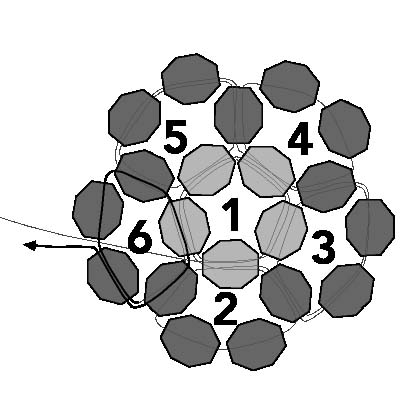 33. Пройдите через последнюю бисеринку пятого круга, вторую из четвертого и первый, нанизанный на шаге 31.