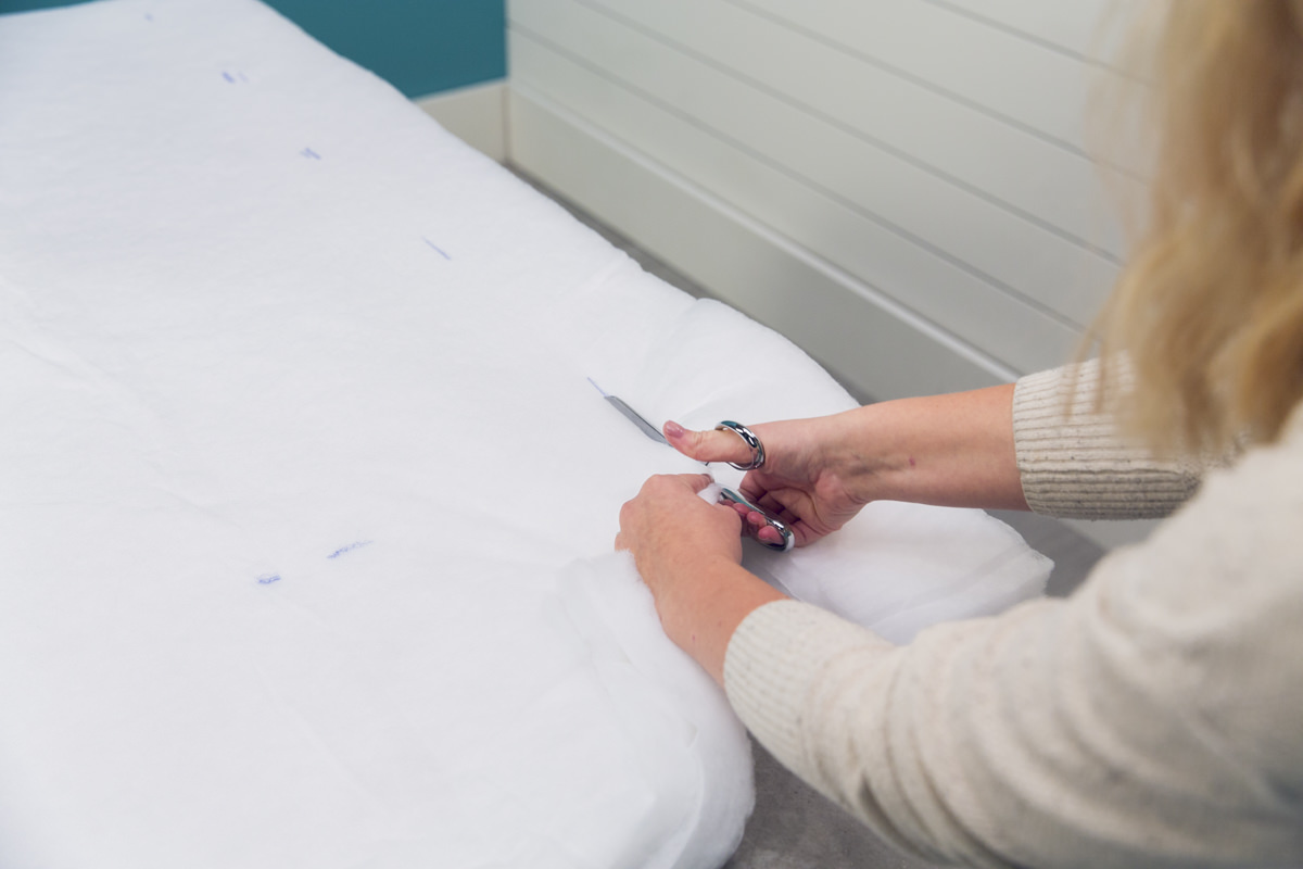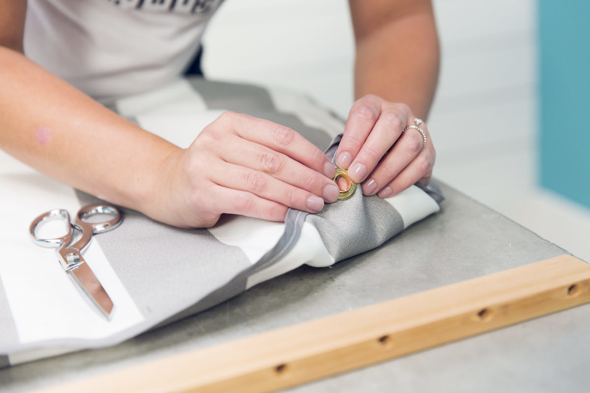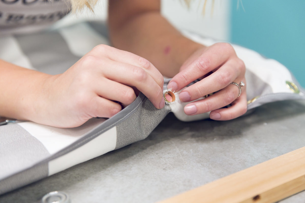 Чтобы соединить кровать с деревянной рамой, мы используем люверсы. Отцентрируйте распределительную планку по краю ткани и отметьте все отверстия на ткани - всего их должно быть 22.