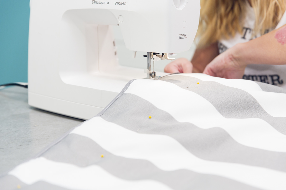 Вместо того, чтобы подшивать края, используйте кромочную ленту. (Если у вашего полотна ширина больше 1,4 м, можно просто подвернуть ее края и прострочить.)