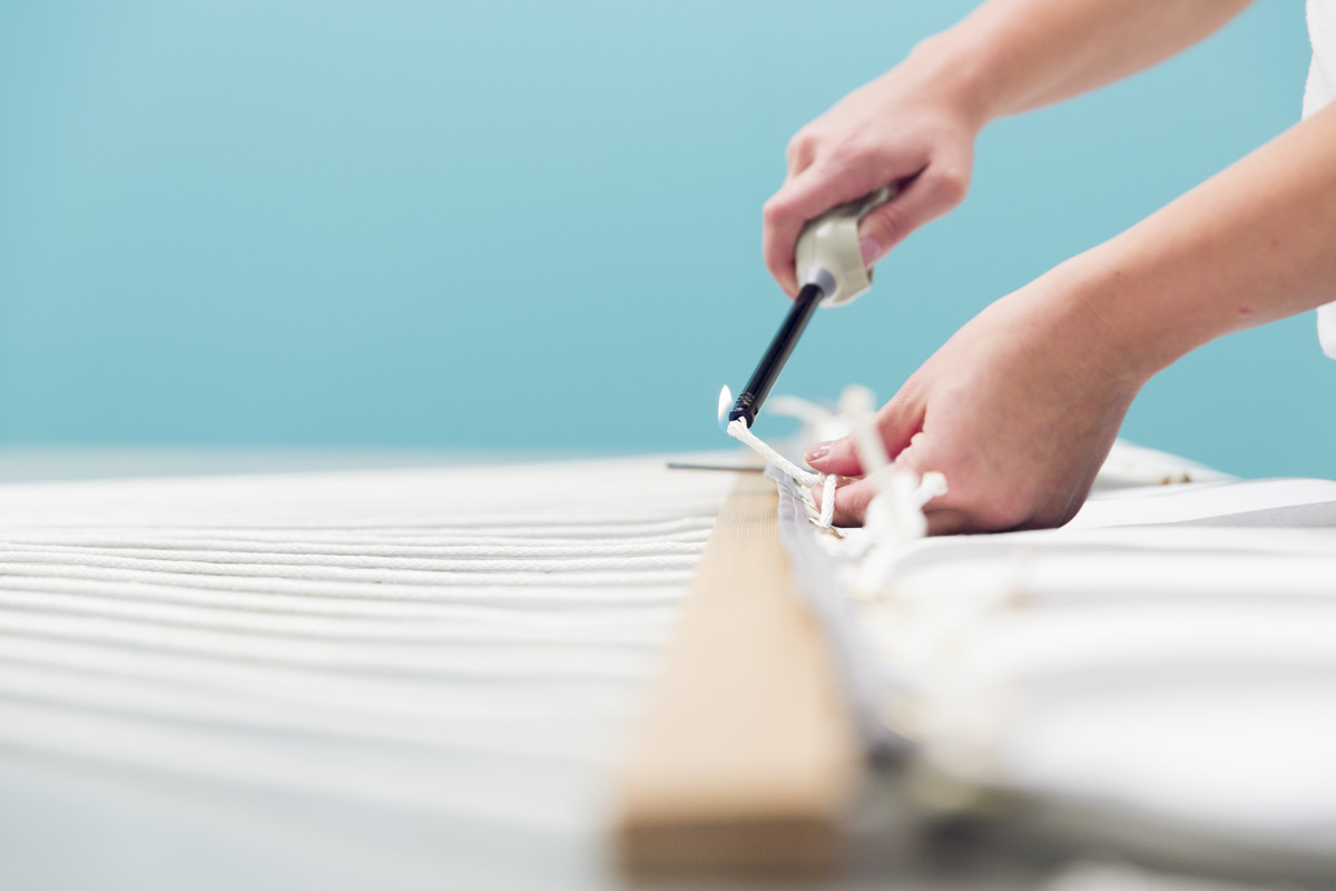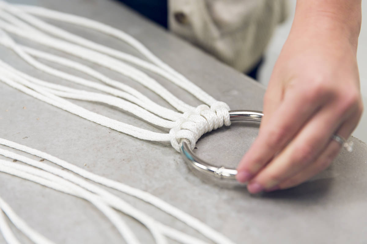 Чтобы соединить все детали, проденьте каждый шнур узла последовательно через отверстия в рамке, а затем через люверсы и завяжите соседние шнуры на узлы на изнаночной стороне гамака. Если хотите укрепить квадратный узел, поместите немного супер-клея в центр узла, чтобы зафиксировать его. Начинайте завязывать узлы, начиная с двух самых средних шнуров, затем переместитесь к самым крайним с обеих сторон. Идея состоит в том, чтобы иметь в качестве эталона три основных узла для создания одинакового натяжения шнуров.