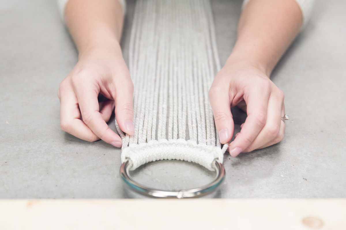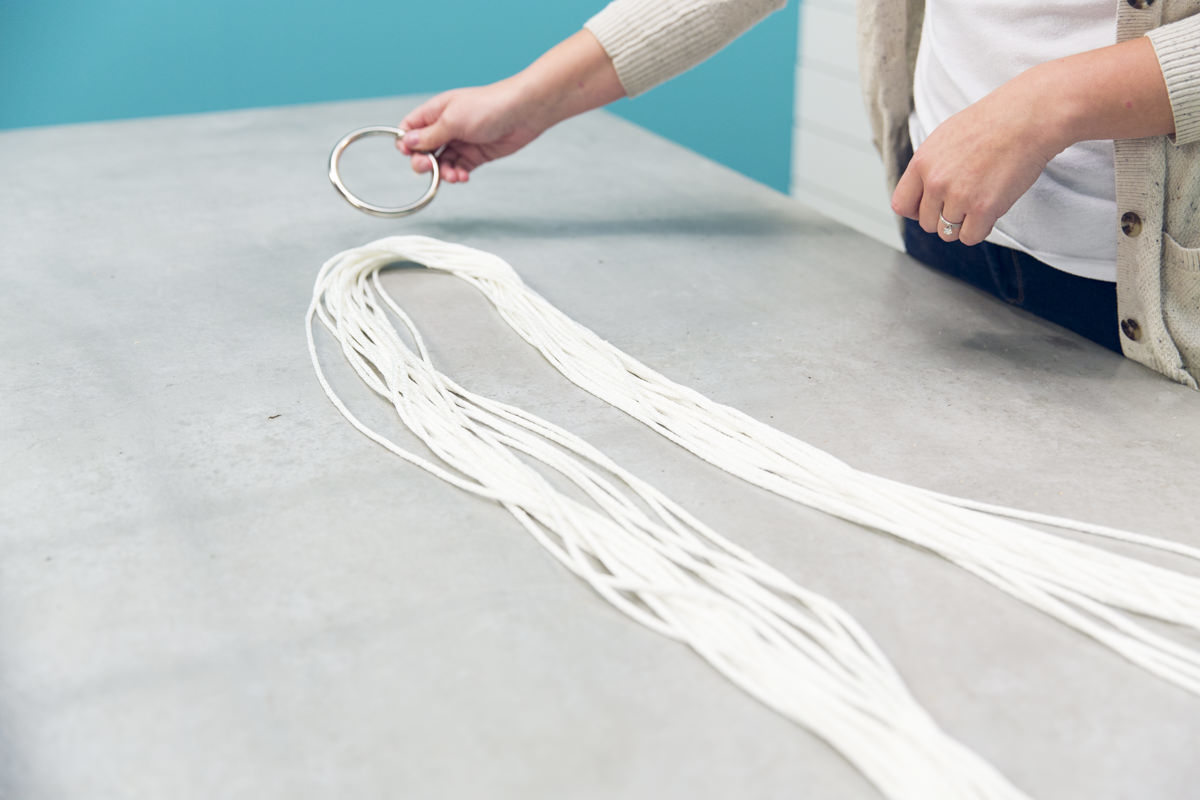 Для плетения мы используем два типа узлов: коровий узел, чтобы прикрепить шнуры к кольцу, и треугольный узел для создания плетения. Сложите отрезки паракорда пополам, выровняйте концы шнуров и привяжите их к кольцу.