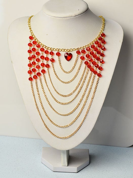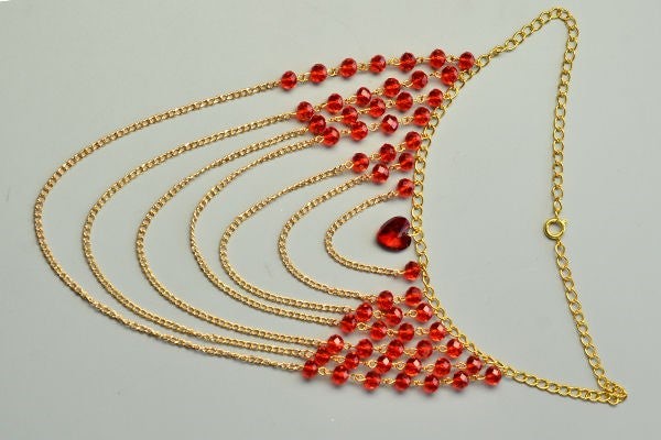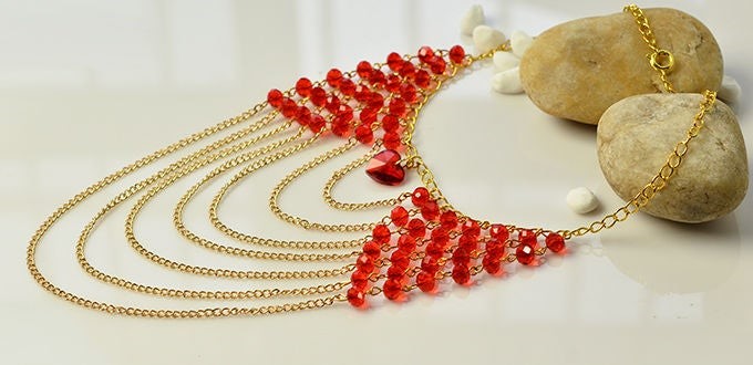 Женские украшения, в которых сочетаются декоративные элементы разные по фактуре и по цвету, смотрятся очень эффектно, если правильно подобрать дизайн. Сегодня мы предлагаем вам соединить между собой металл и стекло. В этом мастер-классе мы расскажем, как сделать ожерелье из нескольких рядов золотистых цепочек, соединенных с красными гранеными стеклянными бусинами. Это очень простая техника: вам нужно всего лишь уметь выполнять петли из металлических стержней с помощью круглогубцев. Описание каждого этапа работы сопровождается иллюстрациями, так что у вас не должно возникнуть никаких проблем.
