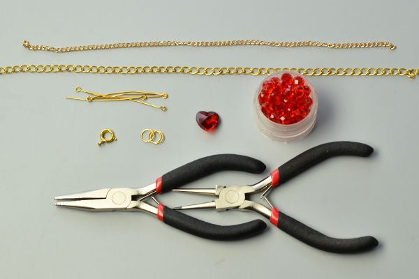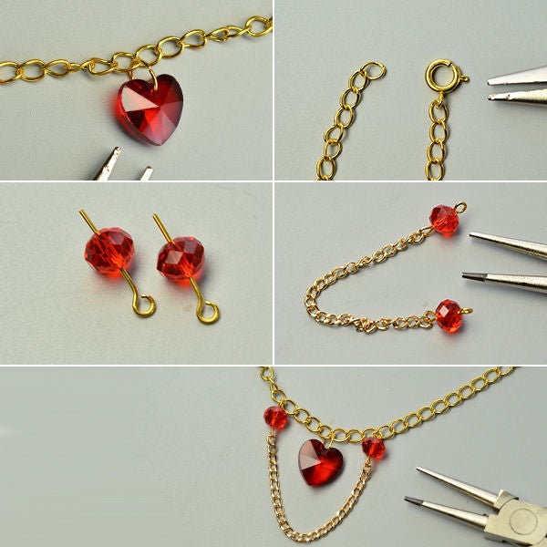 Отрежьте кусок золотистой цепочки с более крупными звеньями и прикрепите красную сердцеобразную бусину по центру этого отрезка с помощью золотистого соединительного кольца;