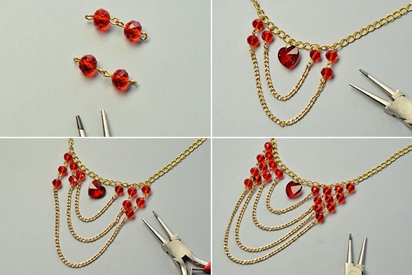 Шаг 4: завершение колье из цепочек и красных стеклянных бусин