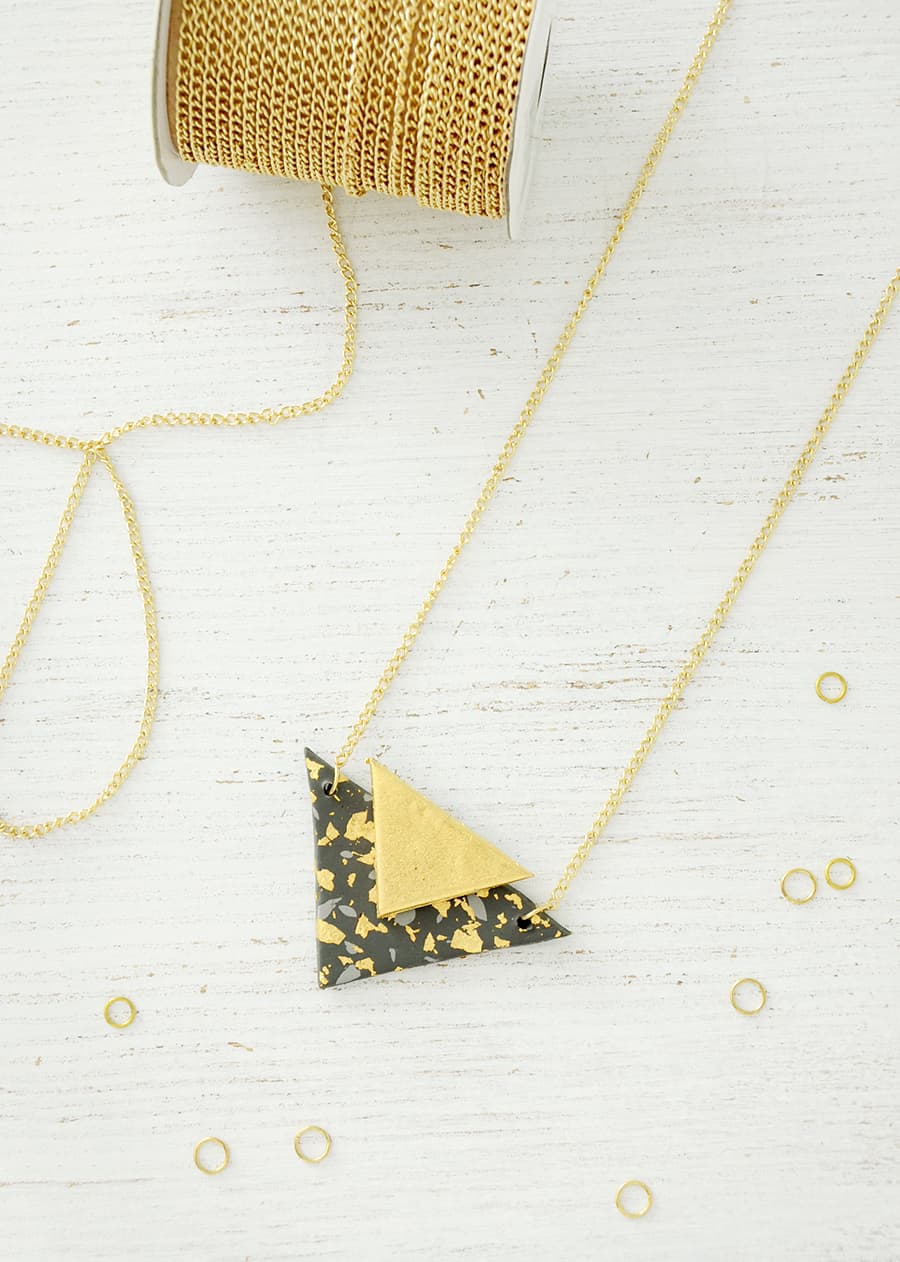 Возьмите кусок ювелирной цепочки такой длины, которая вам нужна для вашего ожерелья. Используя ювелирные плоскогубцы, откройте соединительные кольца и прикрепите их к концам цепочки, а затем проденьте их через заранее сделанные отверстия в глиняных треугольниках и закройте.