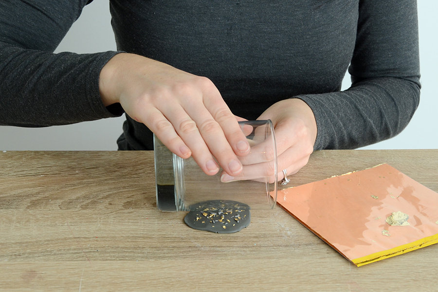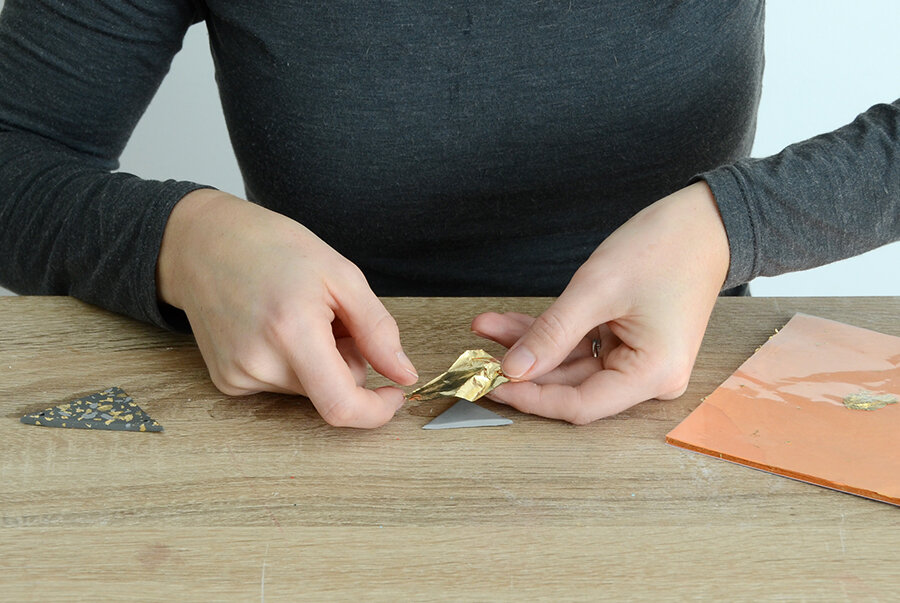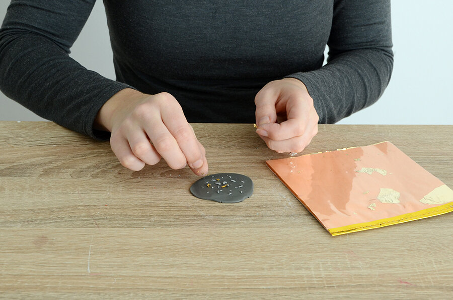 Разложите крошечные кусочки глины контрастного цвета на поверхности вашего плоского глиняного блинчика в хаотическом порядке. Затем также разложите на нем небольшие хлопья сусального золота (фольгу следует просто порвать на мелкие кусочки пальцами).