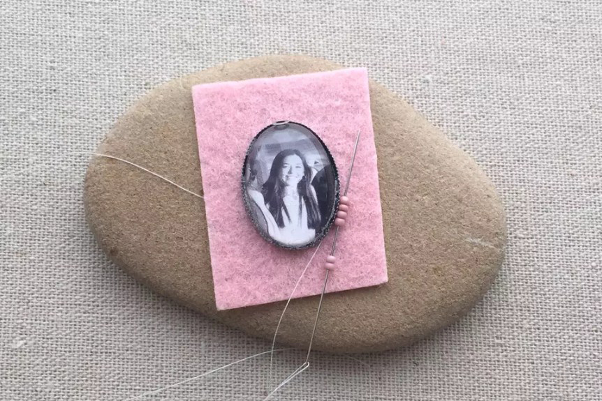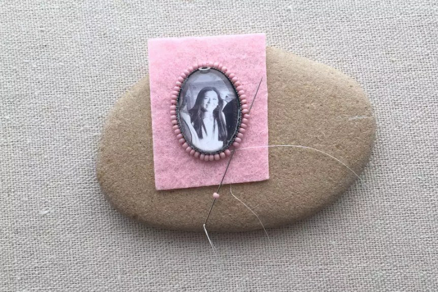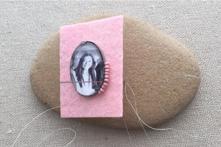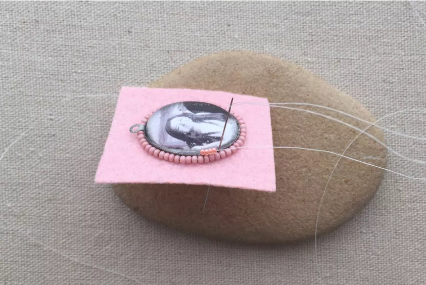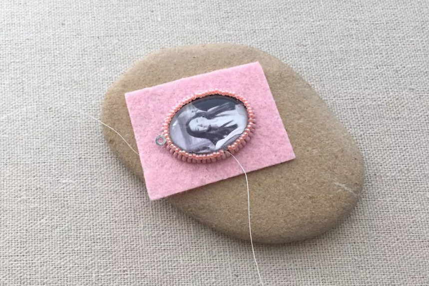 Выведите иглу с длинной нитью с изнанки фетра максимально близко к кабошону. Держите иглу строго вертикально. Оставьте 20 см нити на изнанке. Наберите четыре бисеринки, продвиньте их вплотную к медальону и пришейте к фетру.