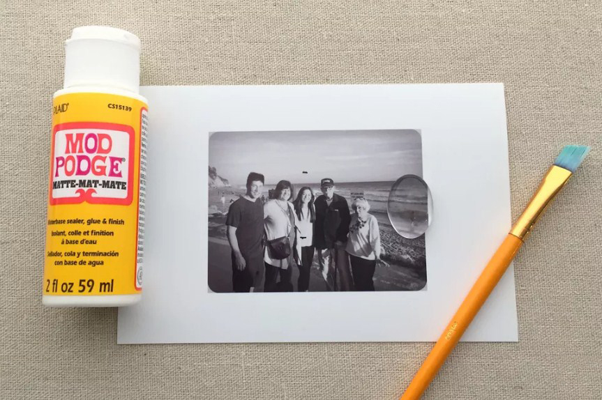Найдя правильное размещение, обрежьте фотографию вверху и внизу. Нанесите на нее Mod Podge либо аналогичный герметизирующий бесцветный клей и приклейте стеклянный кабошон сверху. Удалите пузырьки воздуха и позвольте клею полностью просохнуть.