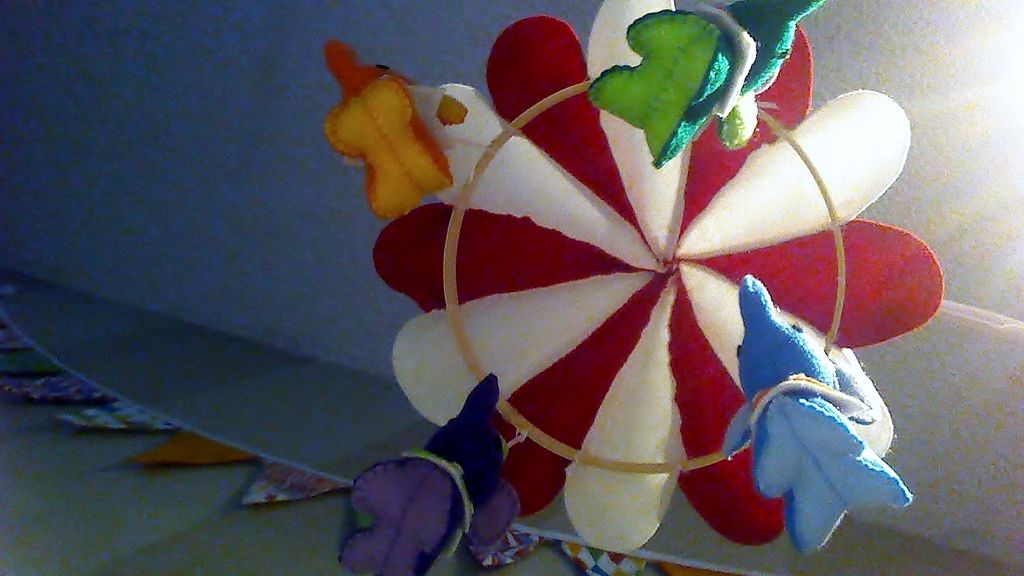 Но при неправильном или неосторожном закреплении мобиля возникает риск, что он упадёт на кроху. А уже немного подросший ребенок во время игры может ненароком уронить игрушку на себя, схватив потянув за какой-либо ее элемент. И для таких случаев очень целесообразно изготавливать мобили из мягких текстильных материалов (обычно фетра либо плюша).