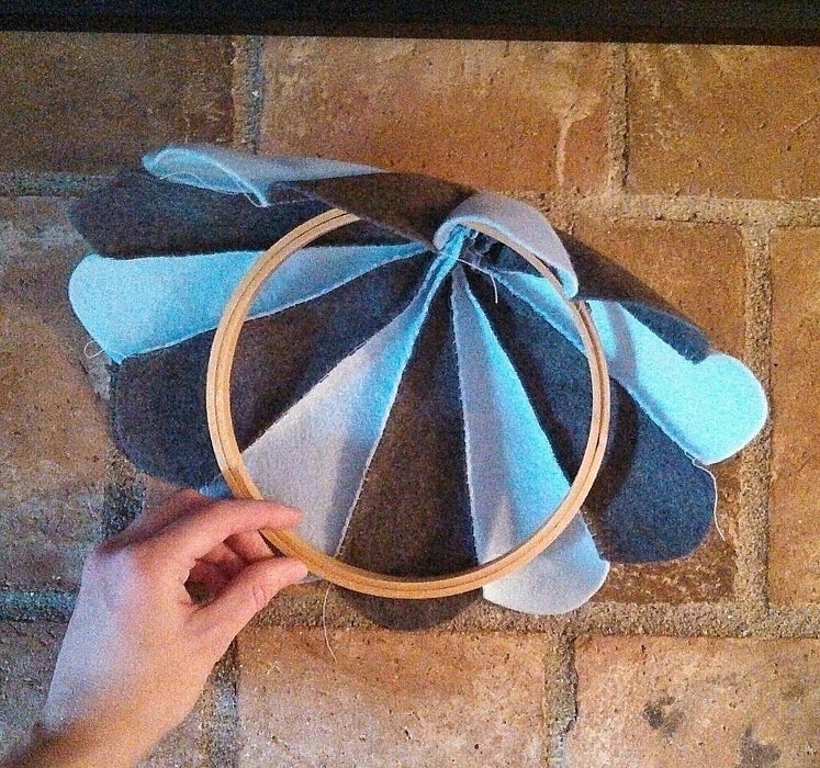 Теперь вы можете прикрепить все, что вы хотите, к кругу от пялец, и прикрепить палатку к той части механизма мобиля, на которую хотите ее повесить.