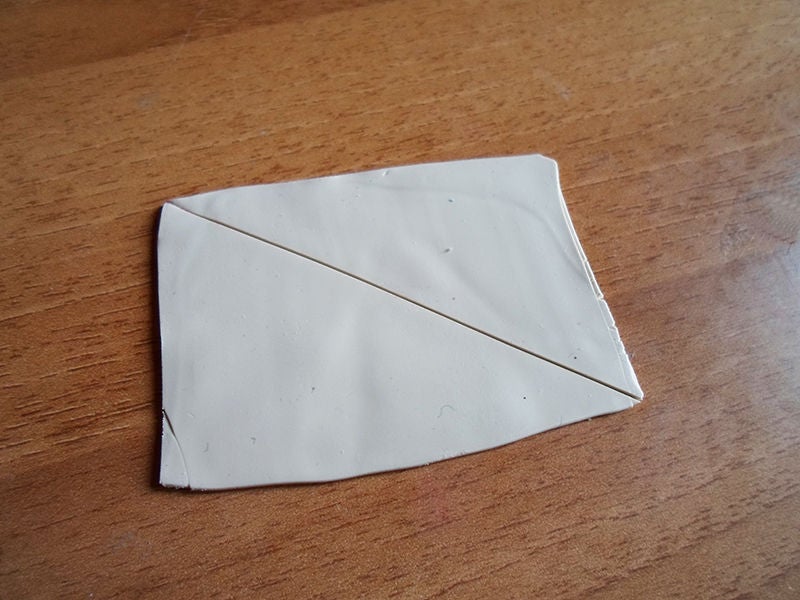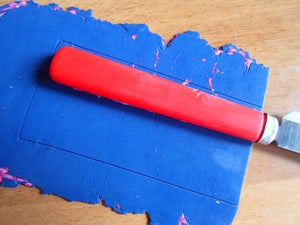 Поместите рукоятку ножа на изнаночную сторону глиняного прямоугольника, чтобы выяснить, насколько большим должен быть кусок глины, который нужен для обертывания.
