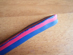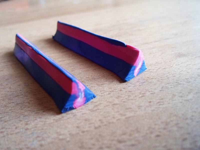 Возьмите еще один кусок голубой глины и сделайте из них 2 тонких колбаски такой же длины, как красно-белая.