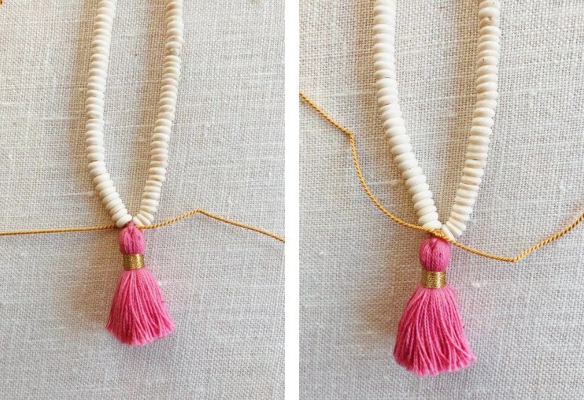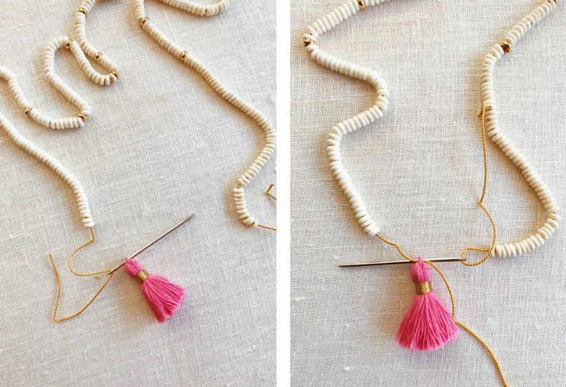 4. Развяжите двойной узел, который вы сделали, чтобы начать нанизывание и втяните нитку в вышивальную иглу. Пропустите ее через верхнюю петельку на кисточке. Удалите иглу, а затем втяните другой конец нитки через иглу и пропустите ее через петельку на кисточке, но уже в противоположном направлении.