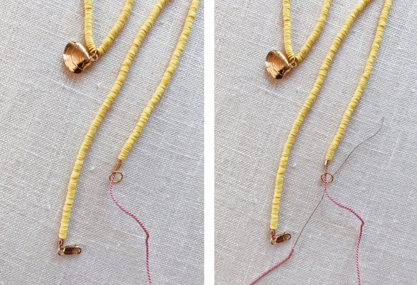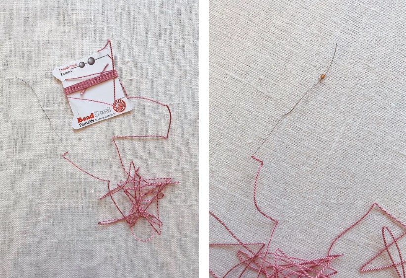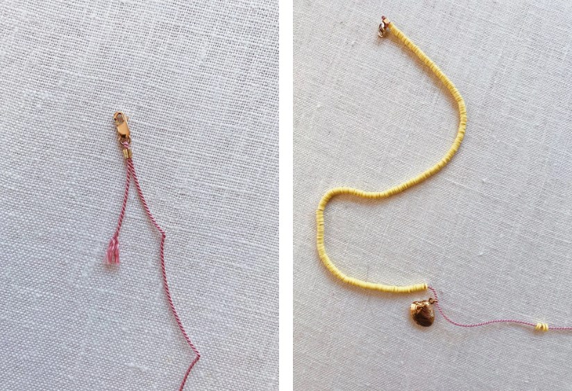 1. Начните с распутывания нити для нанизывания бисера. Мы использовали нить для бисероплетения Griffin, потому что она бывает разных цветов и поставляется с прикрепленной иглой, что делает бисероплетение намного проще. Нанижите на нить обжимную бусинку и затем застежку лобстер.