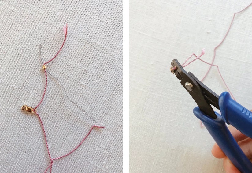 2. Протянув нить через соединительное кольцо застежки, вернитесь иглой через обжимную бусинку. Крепко затяните петлю на застежке, а затем обожмите бусину с помощью щипцов (см. фото). Если у вас нет щипцов, вы можете использовать плоскогубцы, чтобы зажать обжимную бусину.